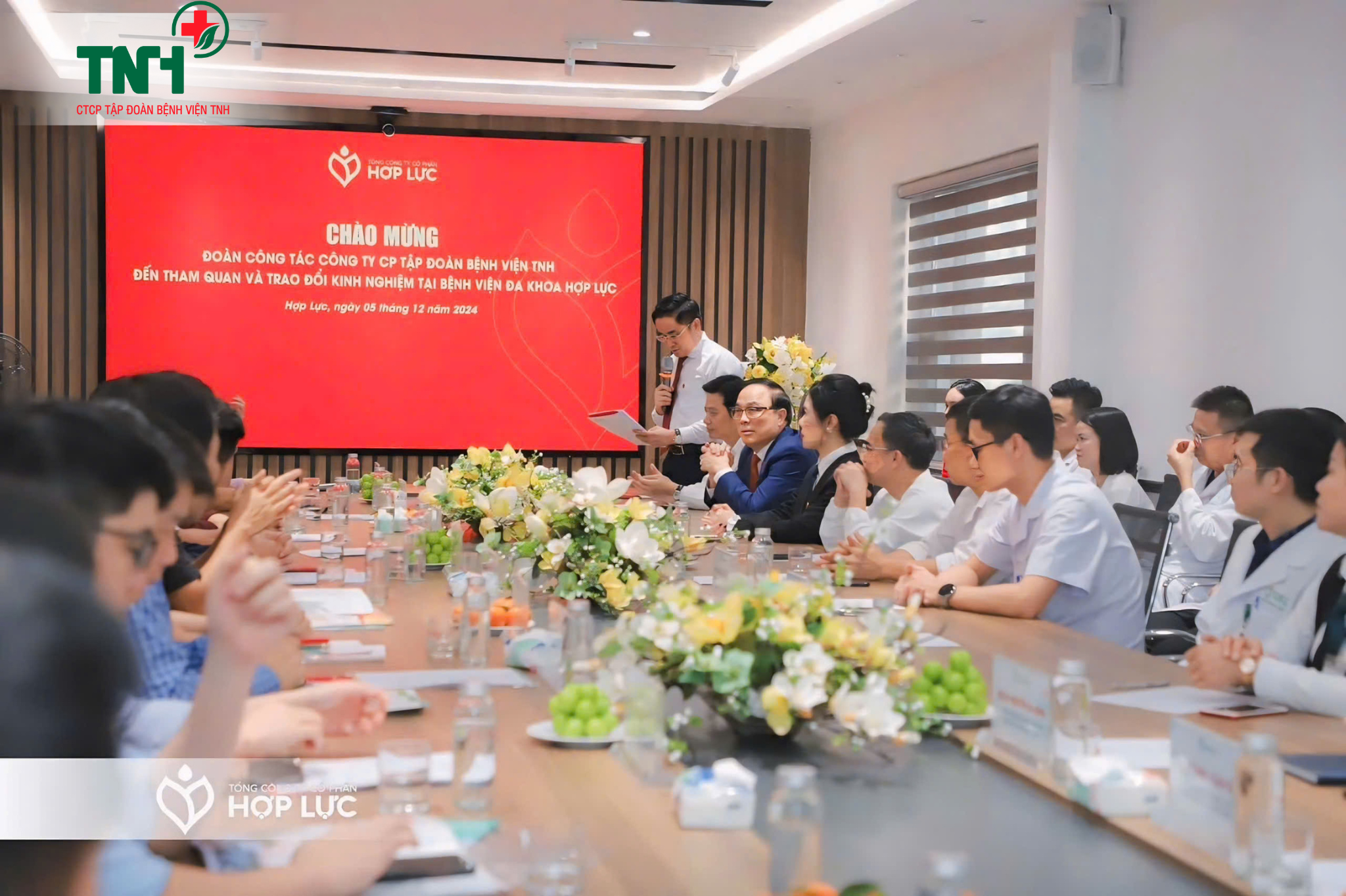 👉 Tại buổi gặp mặt, ông Lê Xuân Tân – Phó Chủ tịch HĐQT, Tổng Giám đốc Công ty và Ông Trần Thiện Sách – Phó Tổng Giám đốc Công ty Cổ phần Tập đoàn Bệnh viện TNH cũng rất vinh dự được chia sẻ rằng Công ty cổ phần Tập đoàn Bệnh viện TNH là đơn vị y tế đầu tiên của Việt Nam được niêm yết trên sàn chứng khoán. Hiện tại, tập đoàn sở hữu hệ thống 3 bệnh viện bao gồm Bệnh viện Quốc tế Thái Nguyên, Bệnh viện Đa khoa Yên Bình Thái Nguyên và Bệnh viện TNH Việt Yên với tổng quy mô khoảng 800 giường bệnh. Ông bày tỏ niềm vinh hạnh khi được đến tham quan và trao đổi kinh nghiệm quản lý bệnh viện với Giáo sư, Viện sĩ Nguyễn Văn Đệ, người đã xây dựng Bệnh viện Đa khoa Hợp Lực phát triển mạnh mẽ và bền vững, với đội ngũ nhân lực tinh gọn nhưng đa nhiệm, hoàn thành xuất sắc nhiệm vụ. Qua buổi làm việc, đoàn công tác đã học hỏi được nhiều bài học quý giá từ mô hình quản lý của Bệnh viện Đa khoa Hợp Lực và mong muốn hợp tác sâu rộng trong nhiều lĩnh vực, từ định hướng phát triển cho đến chuyên môn y tế. Đồng thời, ông Lê Xuân Tân cũng bày tỏ hy vọng được đón tiếp đại diện của Hệ thống Y tế Hợp Lực đến thăm và làm việc tại Công ty Cổ phần Tập đoàn Bệnh viện TNH trong thời gian tới.