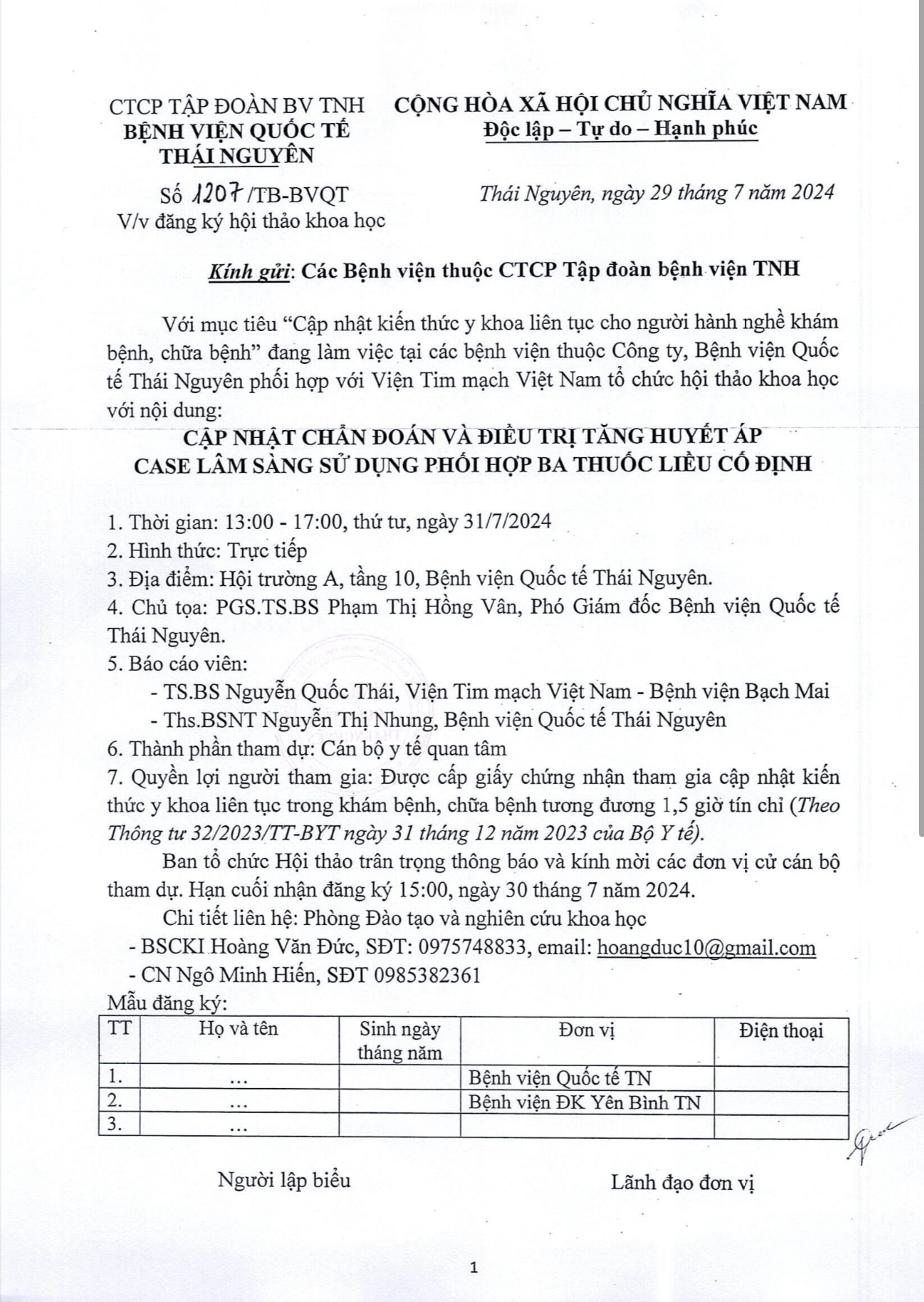 TNH THÔNG BÁO VỀ VIỆC ĐĂNG KÝ THAM GIA HỘI THẢO KHOA HỌC “CẬP NHẬT CHẨN ĐOÁN VÀ ĐIỀU TRỊ TĂNG HUYẾT ÁP CASE LÂM SÀNG SỬ DỤNG PHỐI HỢP BA THUỐC LIỀU CỐ ĐỊNH”