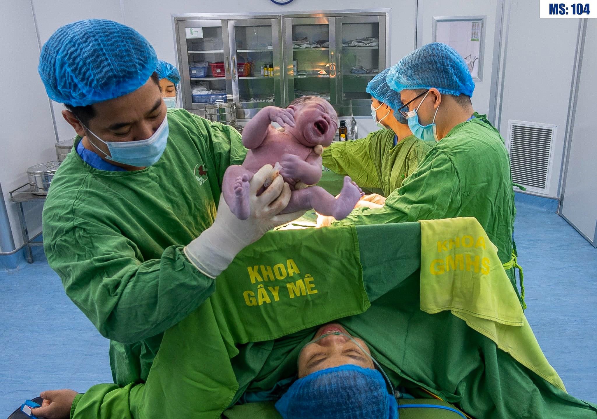 Bức ảnh đoạt giải mang mã số 104 do các bác sĩ Khoa Gây mê hồi sức, Bệnh viện Đa khoa Yên Bình Thái Nguyên ghi lại khoảnh khắc niềm hạnh phúc vô bờ bến của người mẹ khi chào đón con yêu giữa lúc dịch Covid-19 đang diễn biến phức tạp.