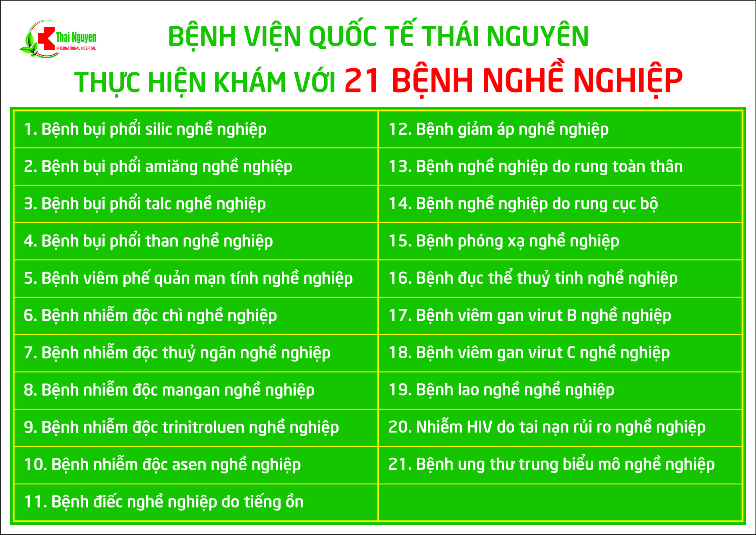 * Tại Bệnh viện Quốc tế Thái Nguyên thực hiện khám với 21 bệnh nghề nghiệp sau: