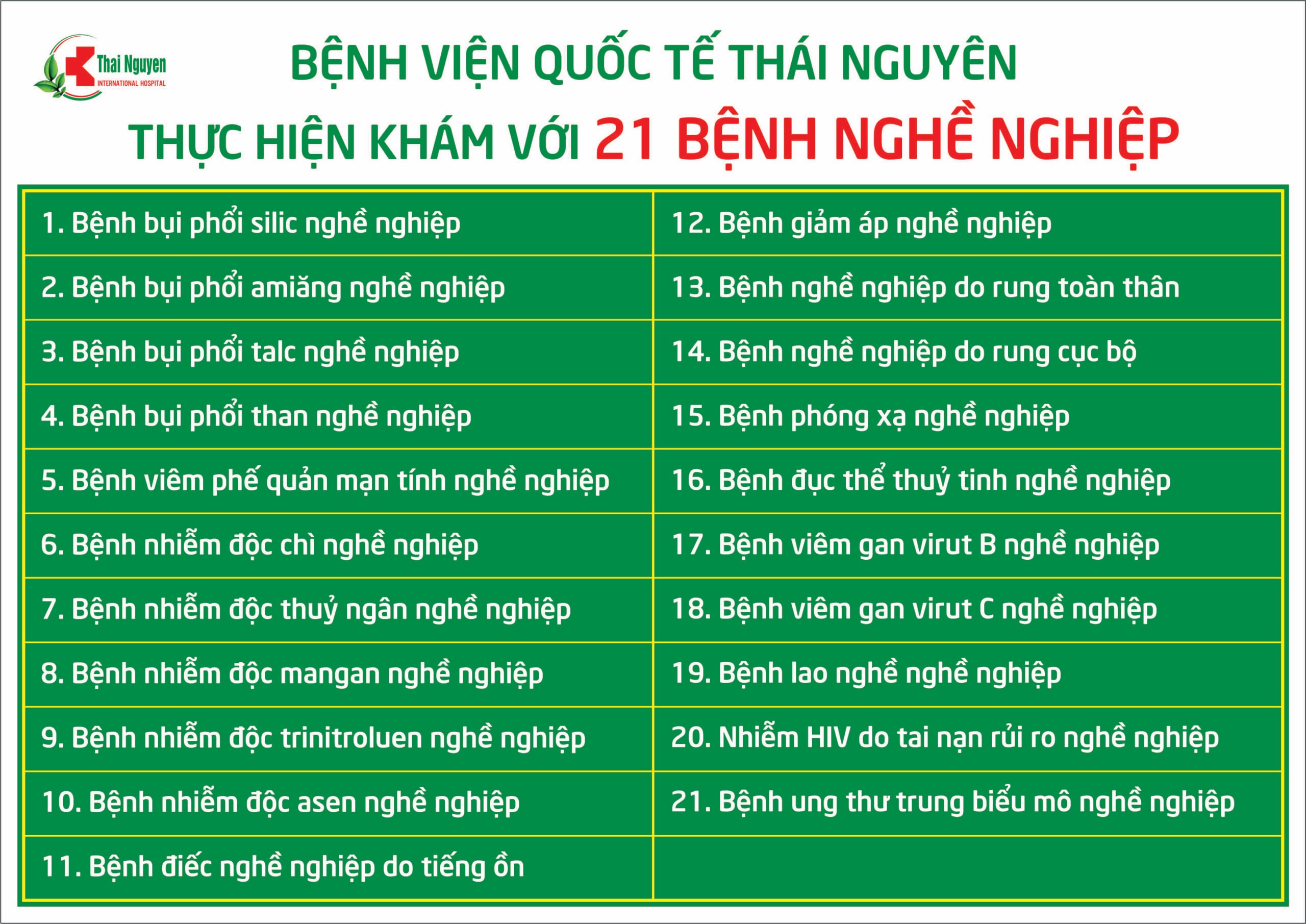 Tại Bệnh viện Quốc tế Thái Nguyên thực hiện khám với 21 bệnh nghề nghiệp sau: