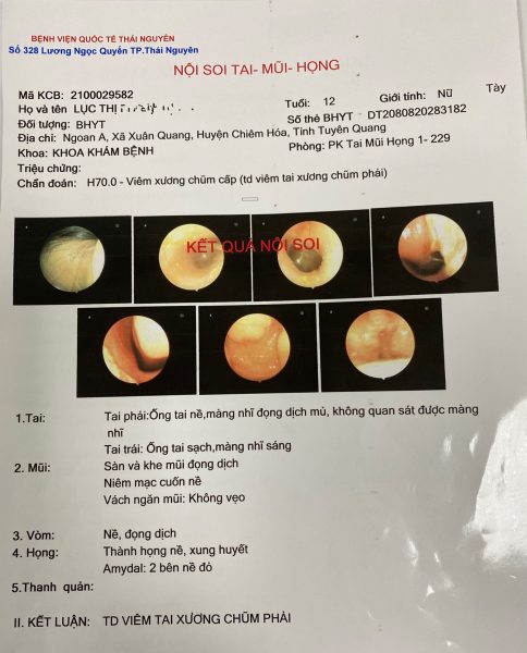 ?Bệnh nhi Lục Thị K.N, 12 tuổi, địa chỉ ở huyện Chiêm Hóa, tỉnh Tuyên Quang bị đau tai, ù tai bên phải một thời gian dài, đã điều trị nhưng không khỏi hẳn. Gần đây, tai phải tiếp tục sưng đau, chảy mủ nên đã đến Bệnh viện Quốc tế Thái Nguyên để thăm khám.