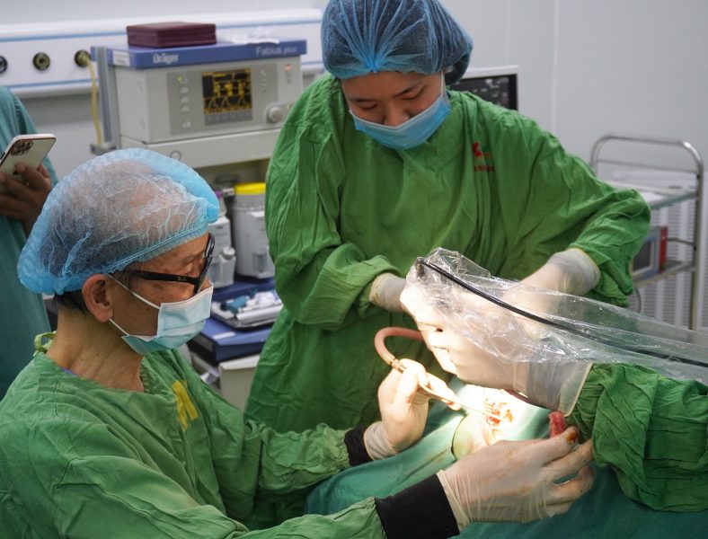 GS.TS Nguyễn Tấn Phong (người ngồi) cùng ekip bác sỹ Khoa Tai- Mũi-Họng, Bệnh viện Quốc tế Thái Nguyên đang thực hiện phẫu thuật cho bệnh nhi Lục Thị K.N.