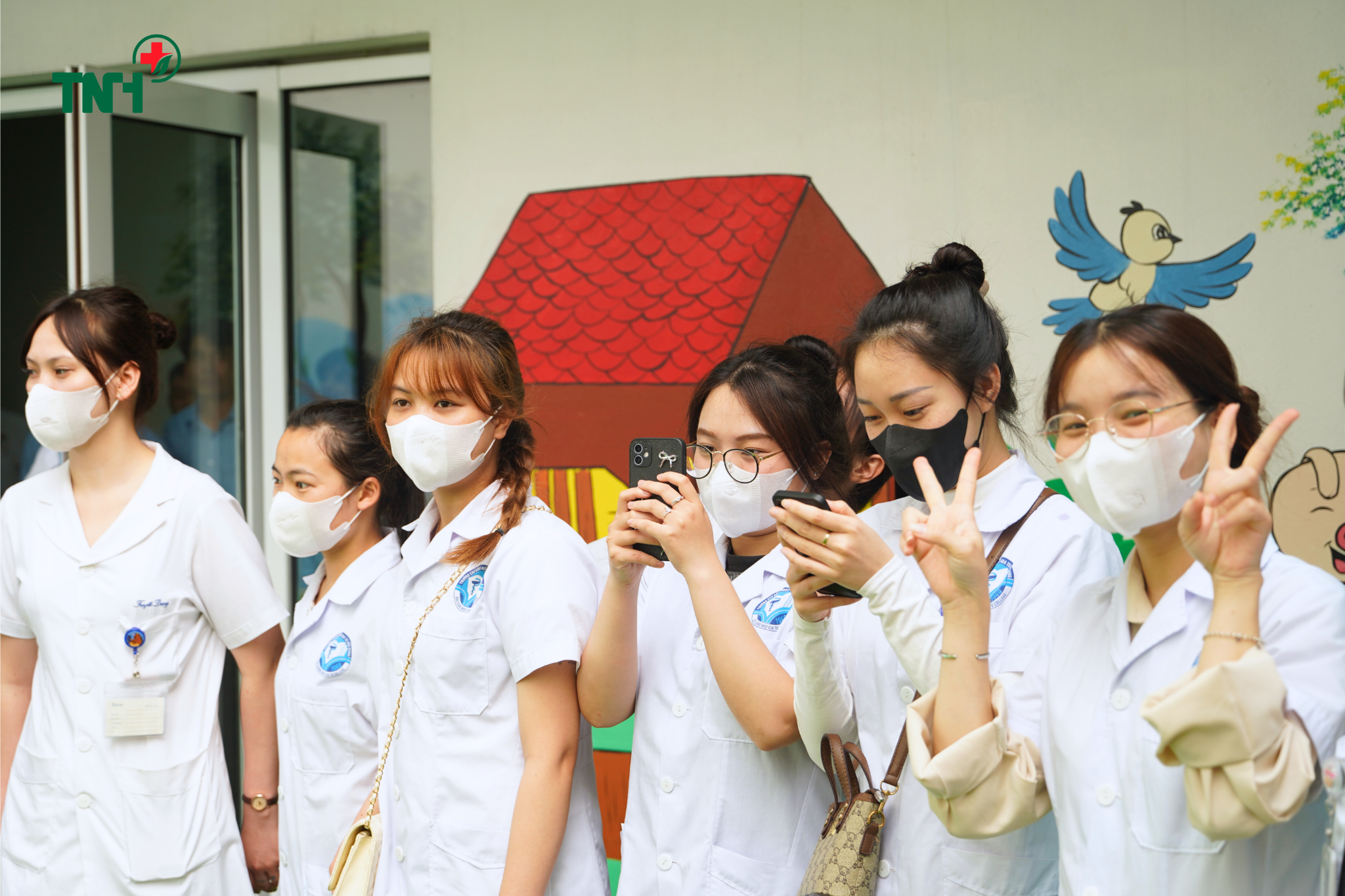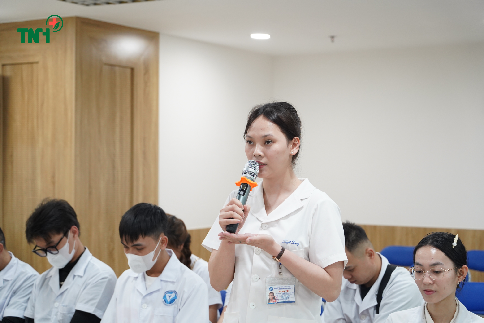 Đặc biệt, các bạn sinh viên còn được giao lưu, đặt câu hỏi trực tiếp với Ban Giám đốc Bệnh viện và đại diện lãnh đạo Công ty. Phần giao lưu diễn ra sôi nổi với nhiều câu hỏi thiết thực, thể hiện sự quan tâm sâu sắc đến cơ hội thực tập, rèn luyện chuyên môn và định hướng nghề nghiệp tương lai.