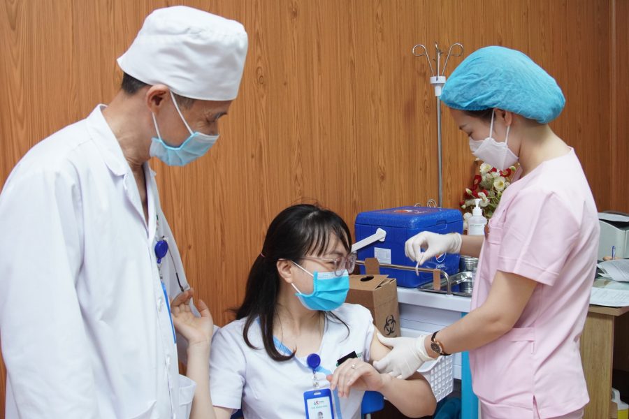 Cán bộ, nhân viên y tế Bệnh viện Quốc tế Thái Nguyên đang được tiêm chủng Vacxin phòng Covid-19