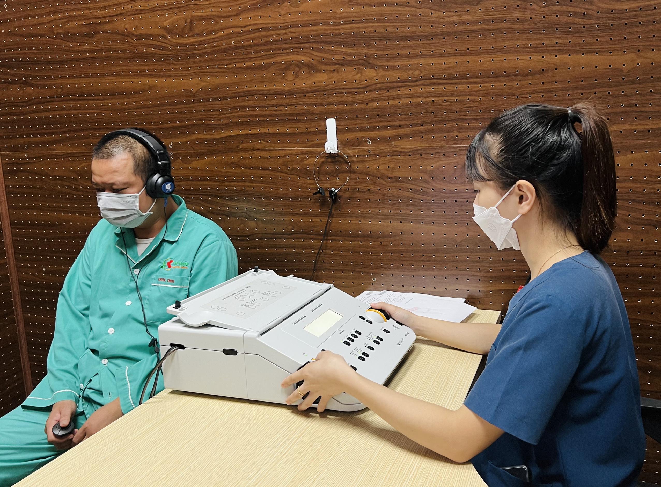 Nhân viên y tế Bệnh viện Quốc tế Thái Nguyên thực hiện đo thính lực đơn âm cho người bệnh