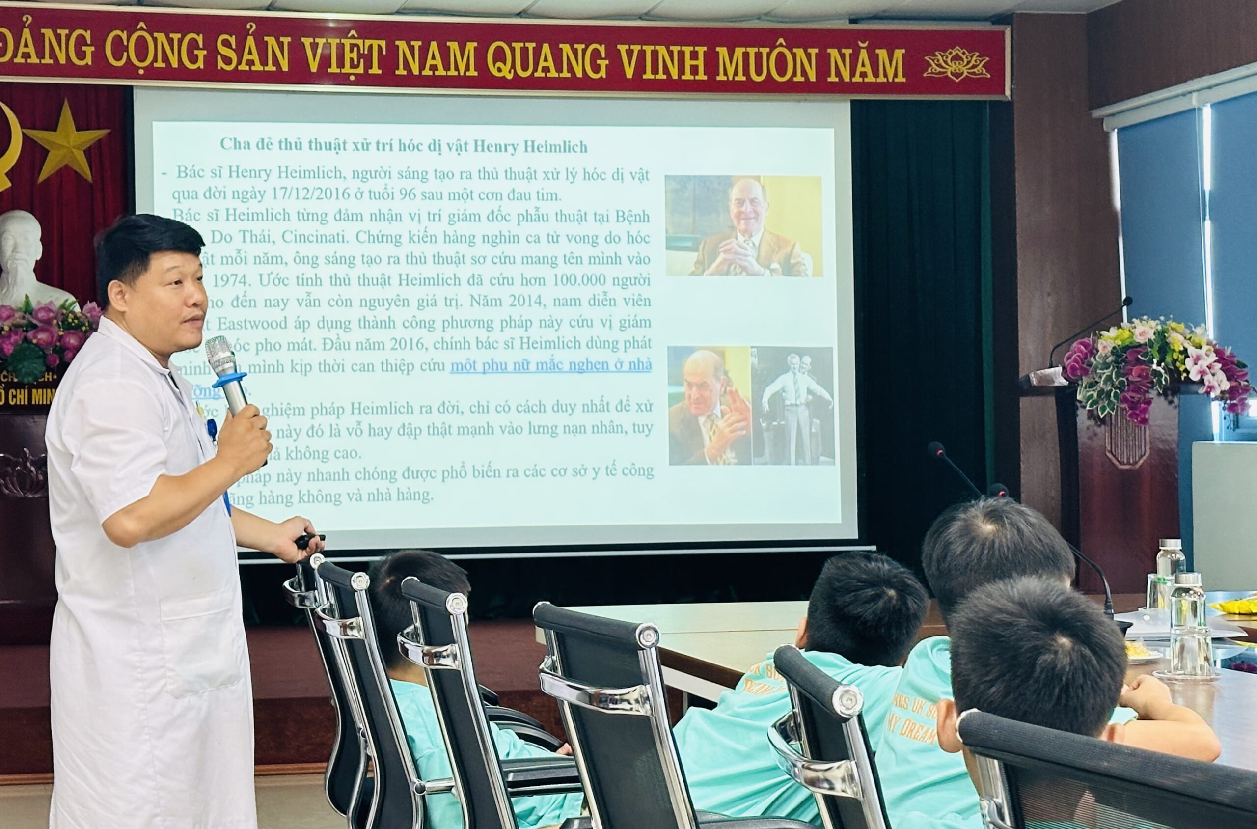 Ths. Bác sĩ CKI Vũ Phương Hà, Phó trưởng khoa Tai Mũi Họng Bệnh viện Quốc tế Thái Nguyên trao đổi với các em học sinh về phương pháp xử trí hóc dị vật bằng nghiệm pháp Heimlich