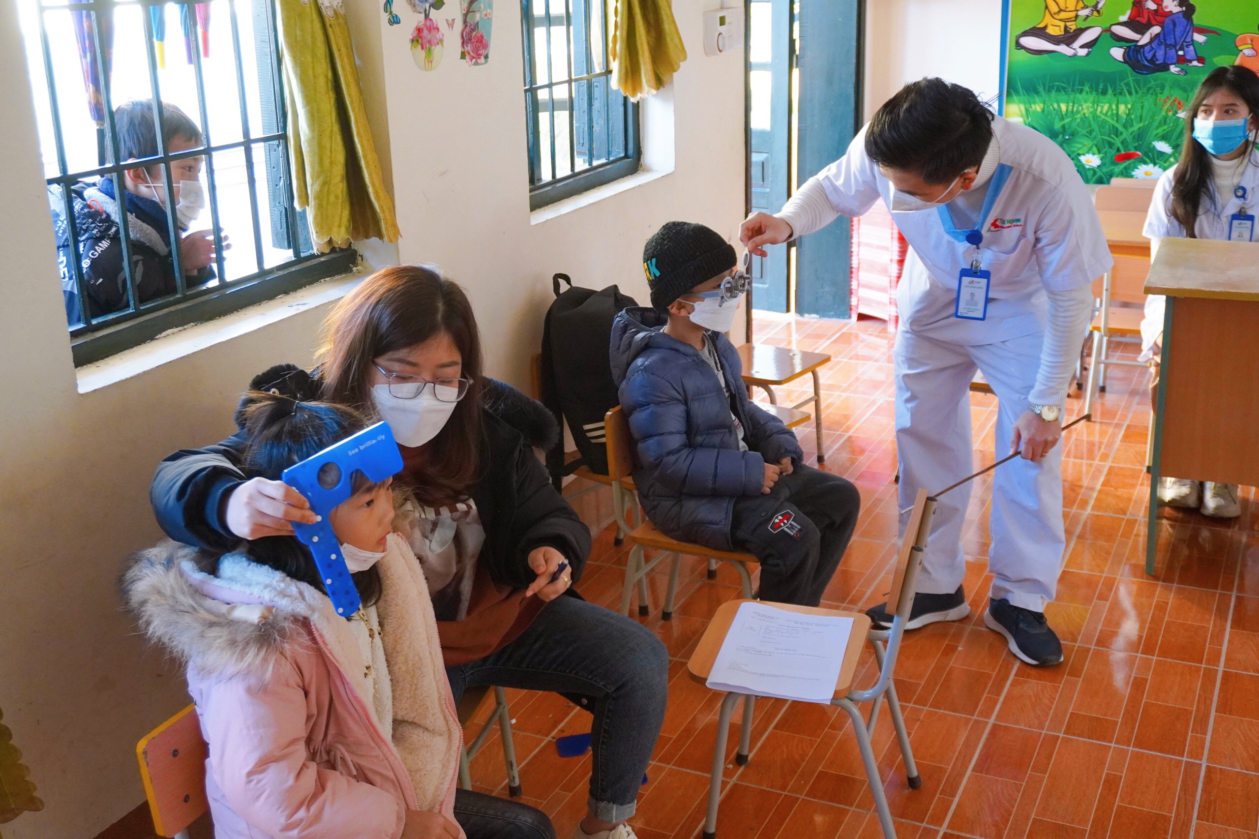 Các bác sĩ thăm khám và tư vấn tận tình cách chăm sóc sức khoẻ đôi mắt cho các em học sinh để có một đôi mắt sáng, khoẻ