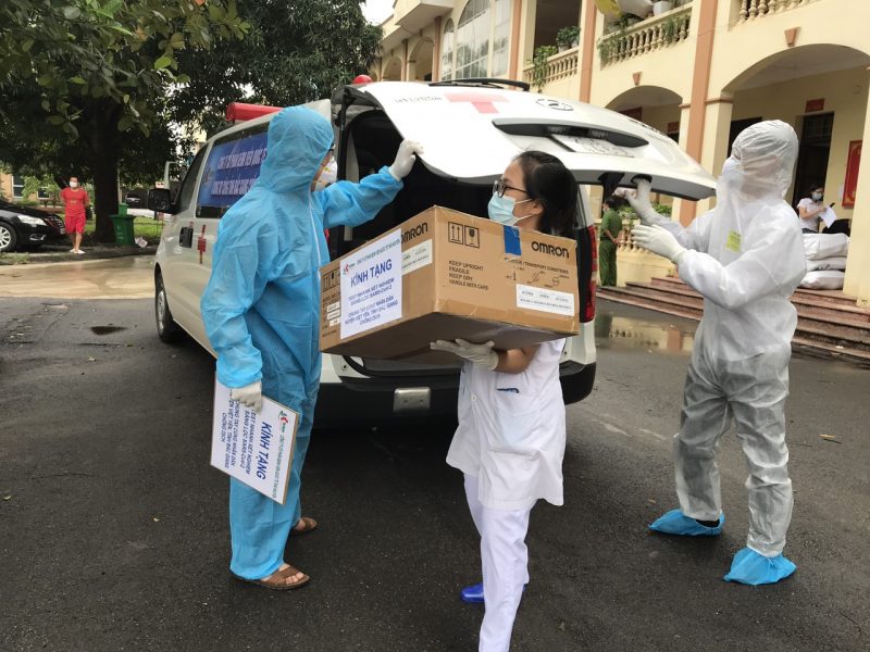 Các cán bộ, nhân viên Công ty Cổ phần Bệnh viện Quốc tế Thái Nguyên trao tặng 400 bộ test nhanh xét nghiệm sàng lọc SARS-CoV-2 cho nhân dân huyện Việt Yên, tỉnh Bắc Giang.