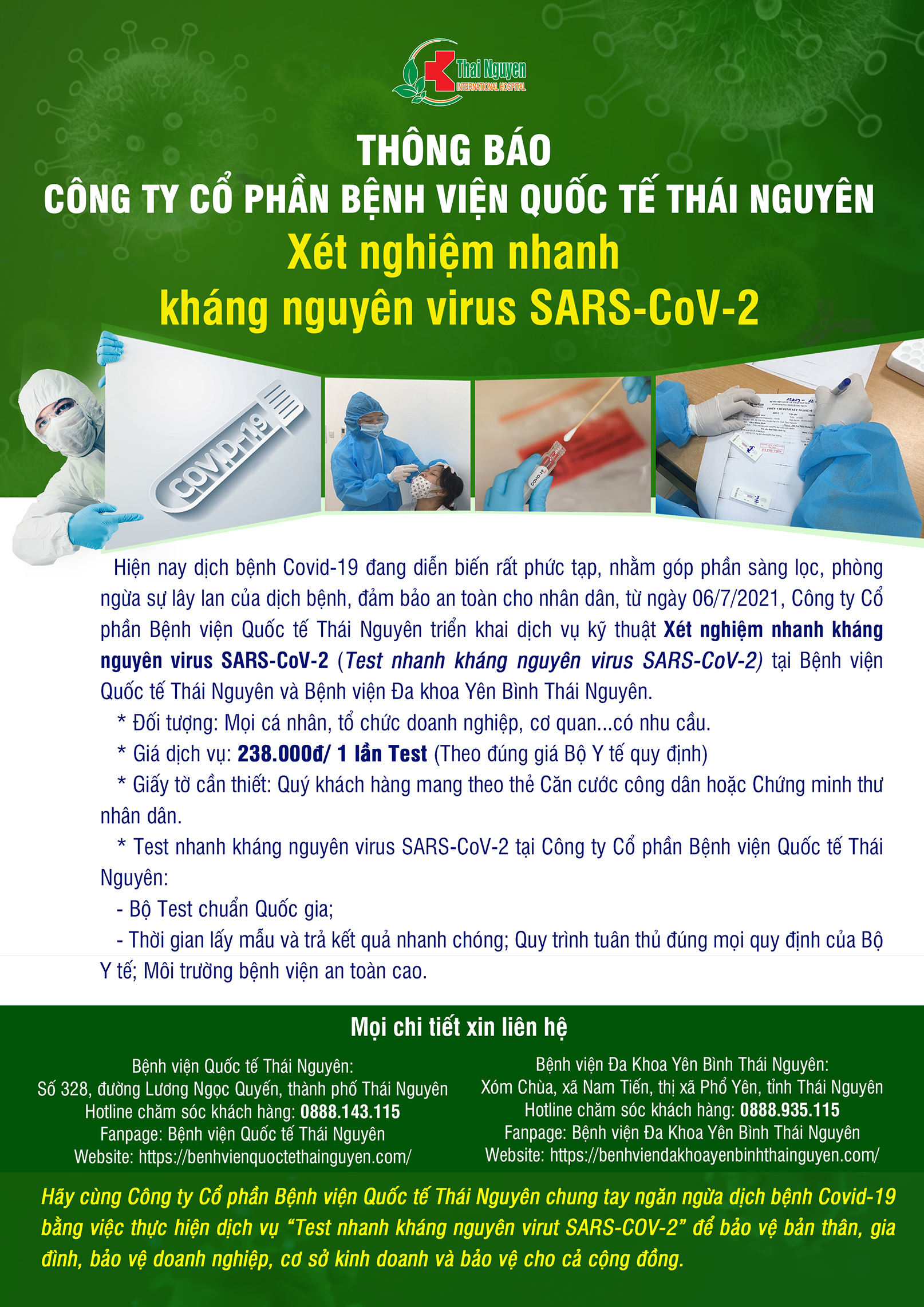?Hiện nay, dịch bệnh Covid-19 đang diễn biến rất phức tạp, nhằm góp phần sàng lọc, phòng ngừa sự lây lan của dịch bệnh, đảm bảo an toàn cho nhân dân. Từ ngày 06/7/2021, Công ty Cổ phần Bệnh viện Quốc tế Thái Nguyên triển khai dịch vụ: Kỹ thuật xét nghiệm nhanh kháng nguyên virus SARS-COV-2 (Test nhanh kháng nguyên virus SARS- COV-2) tại Bệnh viện Quốc tế Thái Nguyên và Bệnh viện Đa khoa Yên Bình Thái Nguyên.