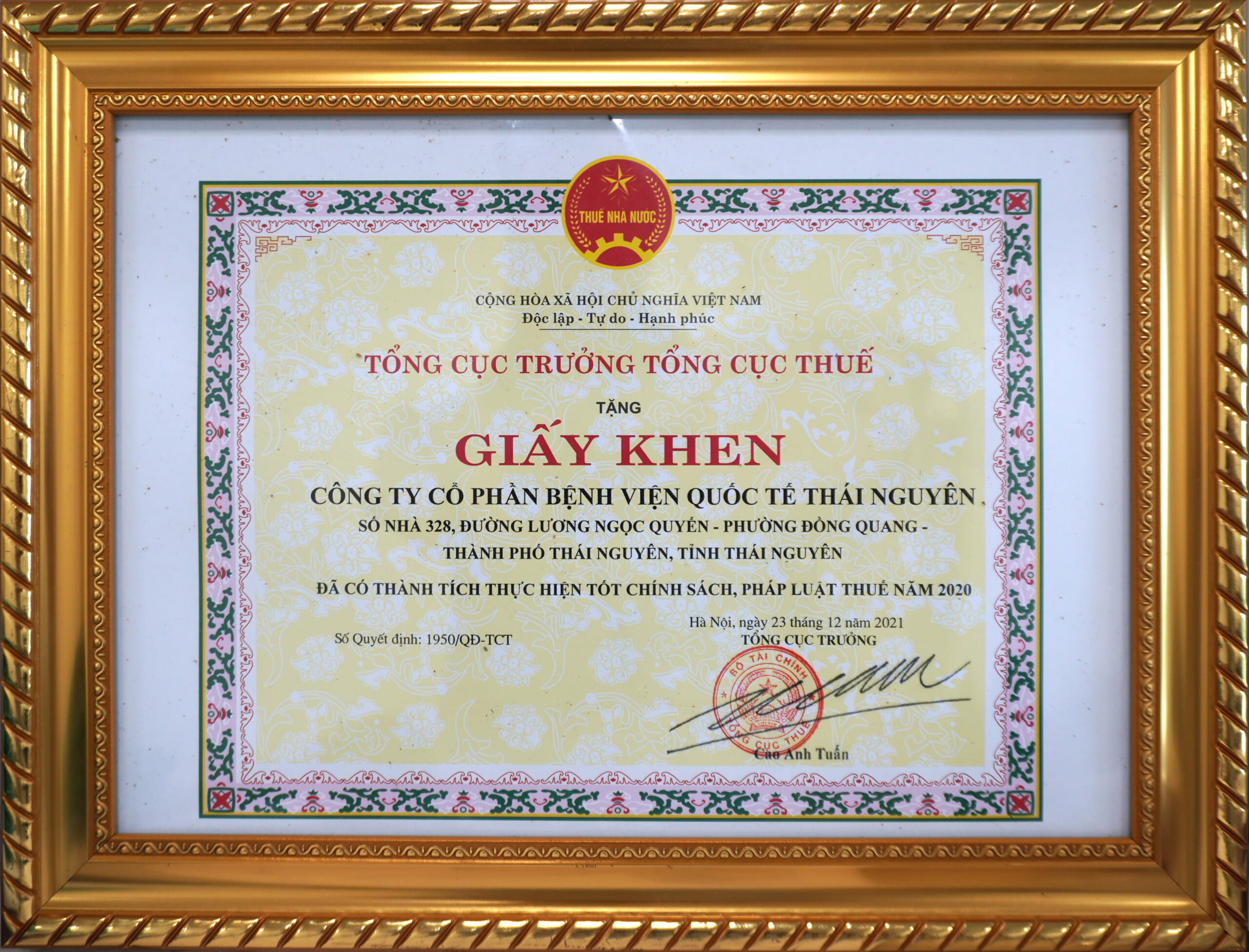 Ngày 30/5/2022, Công ty Cổ phần Bệnh viện Quốc tế Thái Nguyên (TNH) đã vinh dự đón nhận giấy khen của Tổng cục Thuế, vì có thành tích chấp hành tốt chính sách, pháp luật về thuế năm 2020.