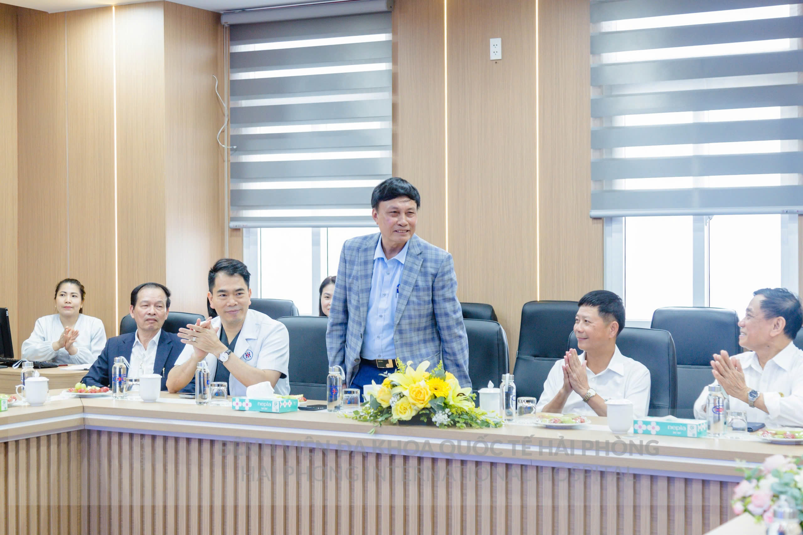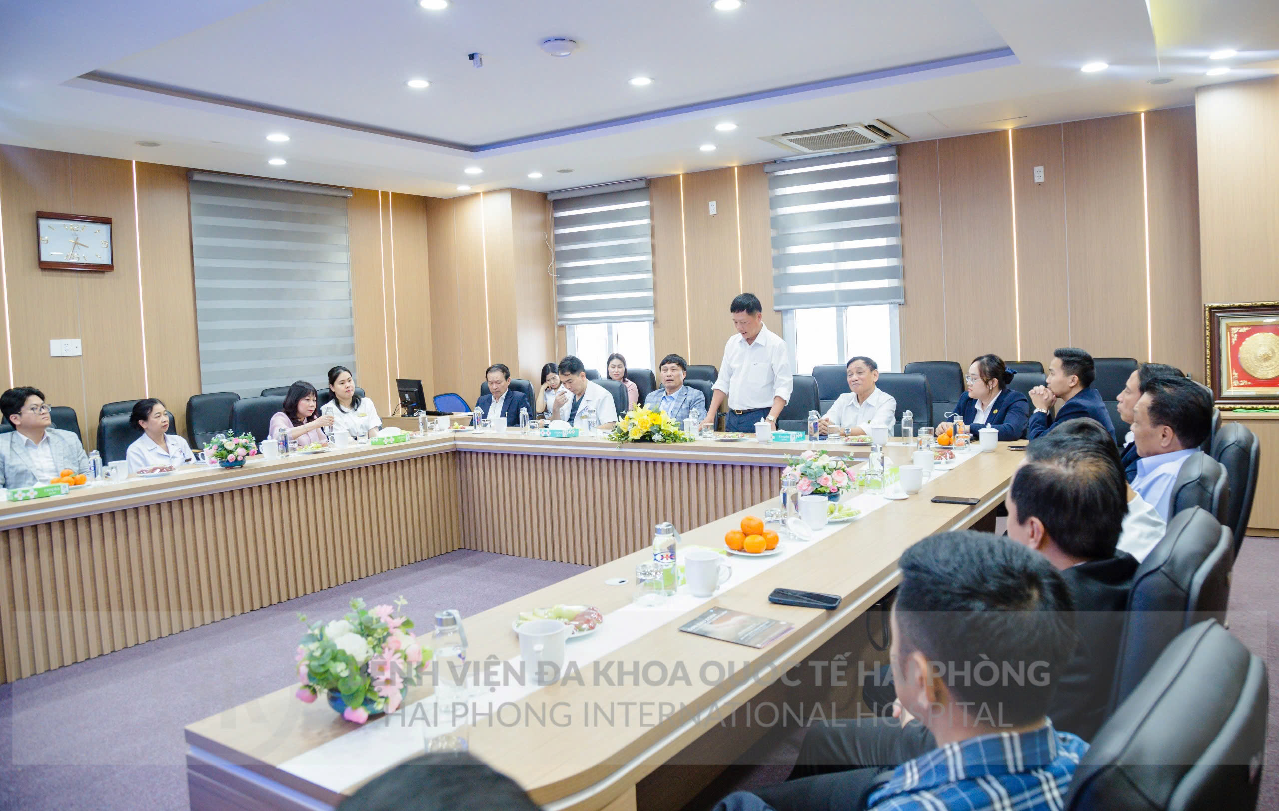 Đoàn công tác đã vinh dự được tiếp đón bởi ông Hoàng Mạnh Thế – Chủ tịch HĐQT, Tổng Giám đốc Tổng Công ty Hàng Kênh; TS.BSNT Hoàng Văn Dũng – Giám đốc điều hành Bệnh viện Đa khoa Quốc tế Hải Phòng; ông Lương Văn Tích – Giám đốc Tài chính cùng đại diện lãnh đạo các phòng ban chuyên môn.