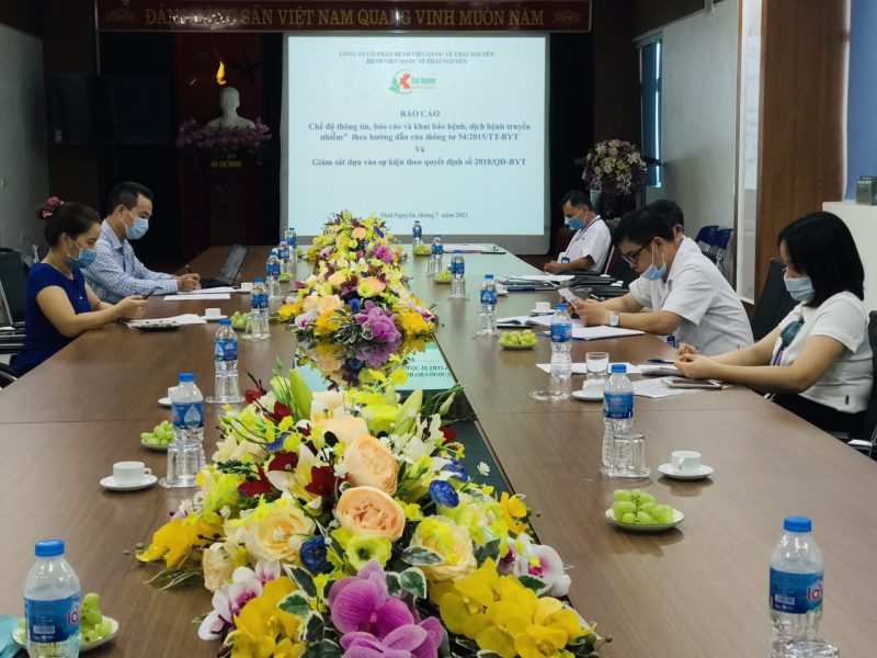 ?Ngày 9/7, đại diện Cục y tế Dự phòng, Bộ Y tế và các chuyên gia đến từ Viện Vệ sinh dịch tễ trung ương đã có buổi làm việc tại Bệnh viện Quốc tế Thái nguyên thuộc Công ty Cổ phần Bệnh viện Quốc tế Thái Nguyên về hoạt động “Chế độ thông tin, báo cáovà khai báo bệnh, dịch bệnh truyền nhiễm” theo hướng dẫn của Thông tư 54/2015 TT- BYT và hoạt động “Giám sát dựa vào sự kiện” theo quyết định số 2018/QĐ-BYT.