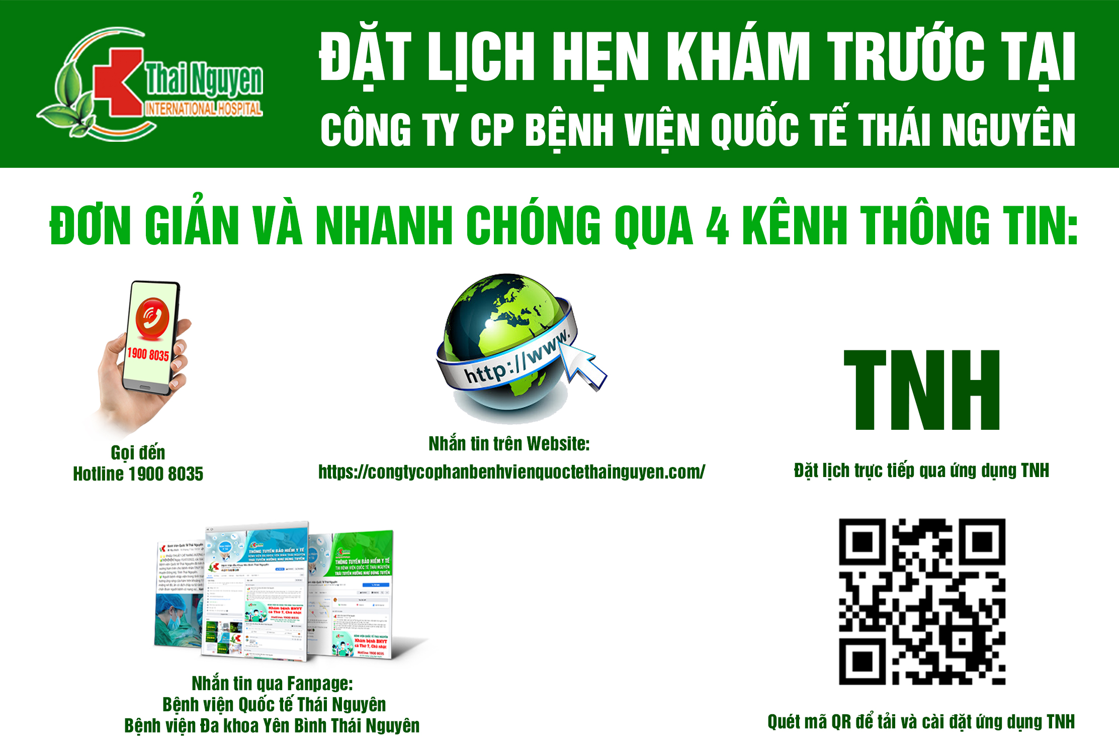 Quý khách sử dụng dịch vụ y tế tại các Bệnh viện của Công ty Cổ phần Bệnh viện Quốc tế Thái Nguyên (TNH) có thể đặt lịch hẹn khám trước đơn giản và nhanh chóng qua 4 kênh thông tin: