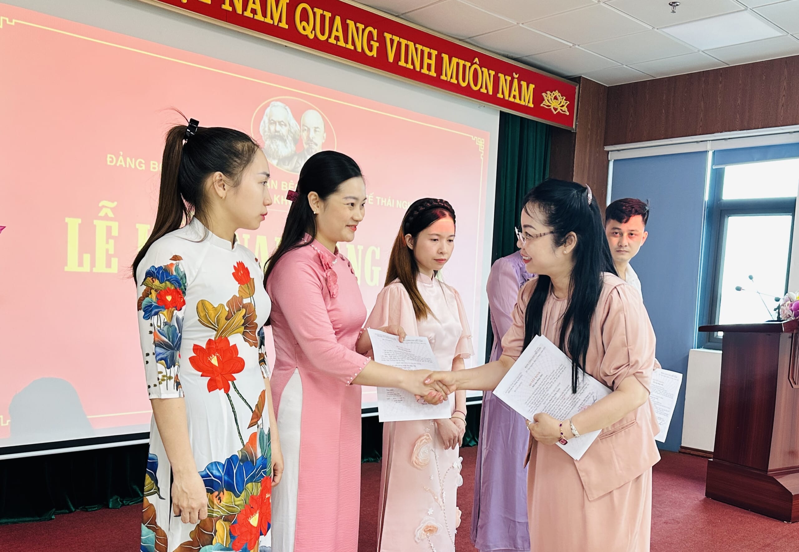 The party admission ceremony took place in a solemn atmosphere, in accordance with the order and procedures of the Charter of the Communist Party of Vietnam. Mrs.Cao Thi Hong, Secretary of the Party Committee of Thai Nguyen International Hospital Joint Stock Company, presented the Party admission decision and congratulated the 5 outstanding comrades after a period of striving and training to be honored to stand in the ranks of the Communist Party of Vietnam.