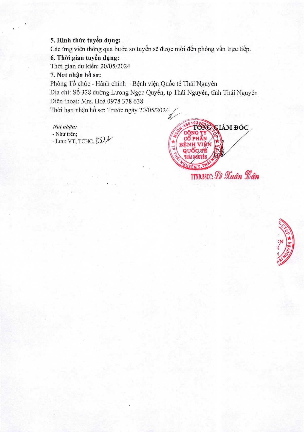 Thai Nguyen International Hospital Joint Stock Company announces recruitment as follows: