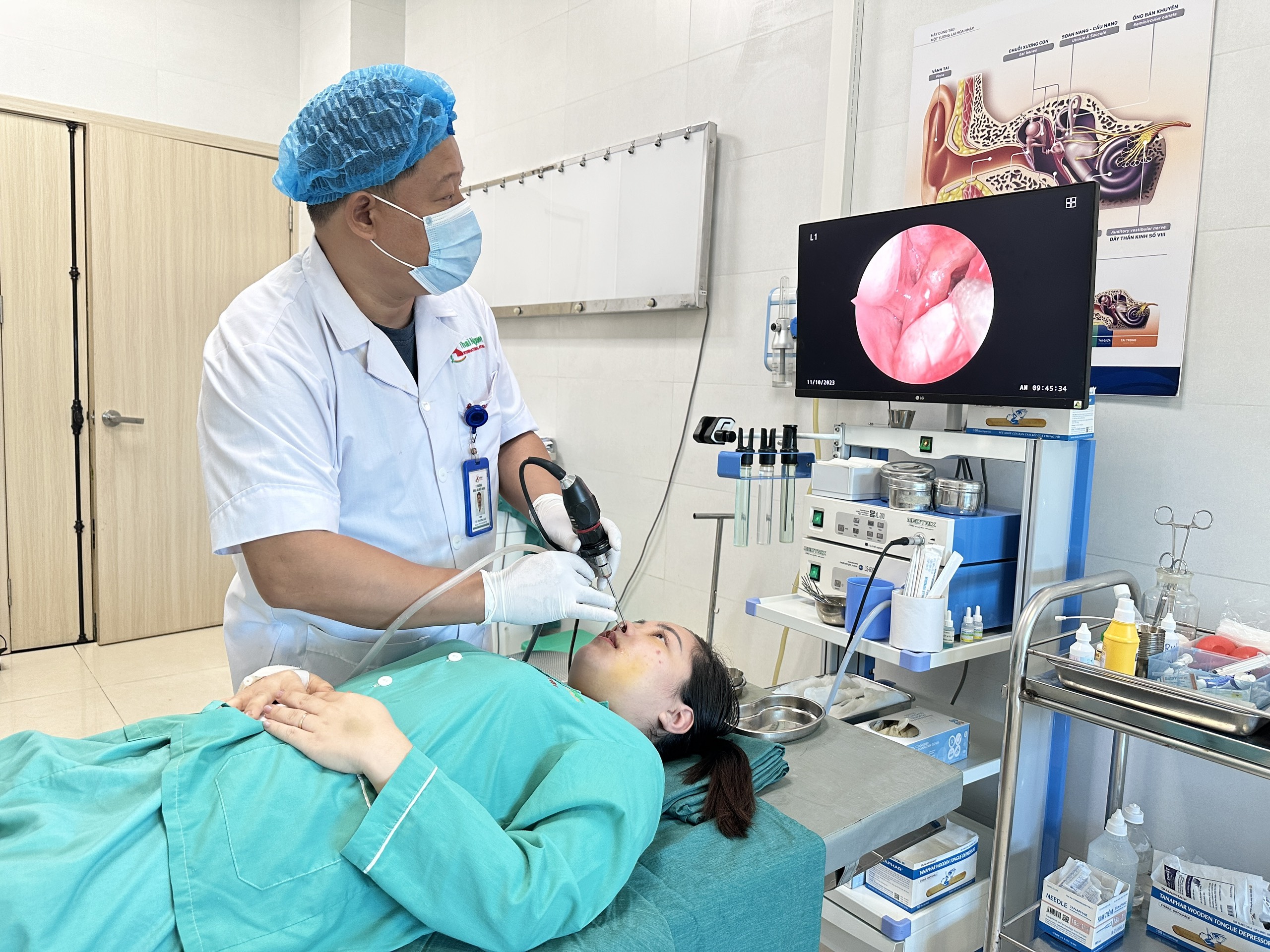 Doctor CKI Vu Phuong Ha, Deputy Head of Ear-Nose-Throat Department, Thai Nguyen International Hospital visited patient room and conduct endoscopy to assess the condition of the surgical cavity and provide post-operative care for patients after surgery