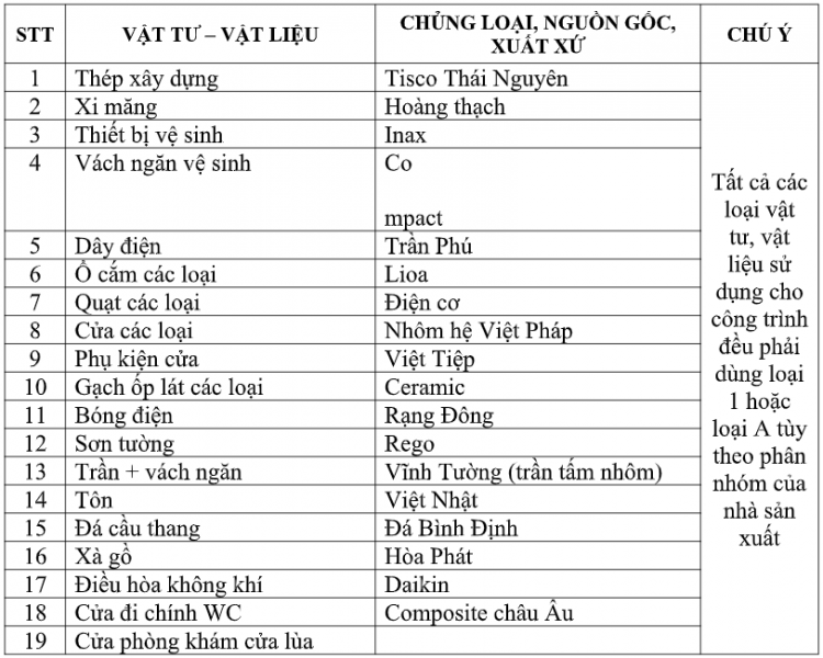 Nhà thầu phải sử dụng đúng chủng loại vật tư, vật liệu, nguồn gốc xuất xứ cũng như nhà sản xuất theo yêu cầu của HSMT, còn các loại vật tư, vật liệu chưa được thống kê đầy đủ trong bảng chỉ dẫn kỹ thuật này yêu cầu nhà thầu trong quá trình xây dựng đơn giá cũng nêu đầy đủ thông tin về tất cả các vật tư, thiết bị và dịch vụ liên quan được cung cấp theo hợp đồng phải có xuất xứ rõ ràng, hợp pháp. Nhà thầu phải nêu rõ ký hiệu, mã hiệu, nhãn mác (nếu có) và xuất xứ của vật tư, thiết bị và tính hợp lệ của dịch vụ.