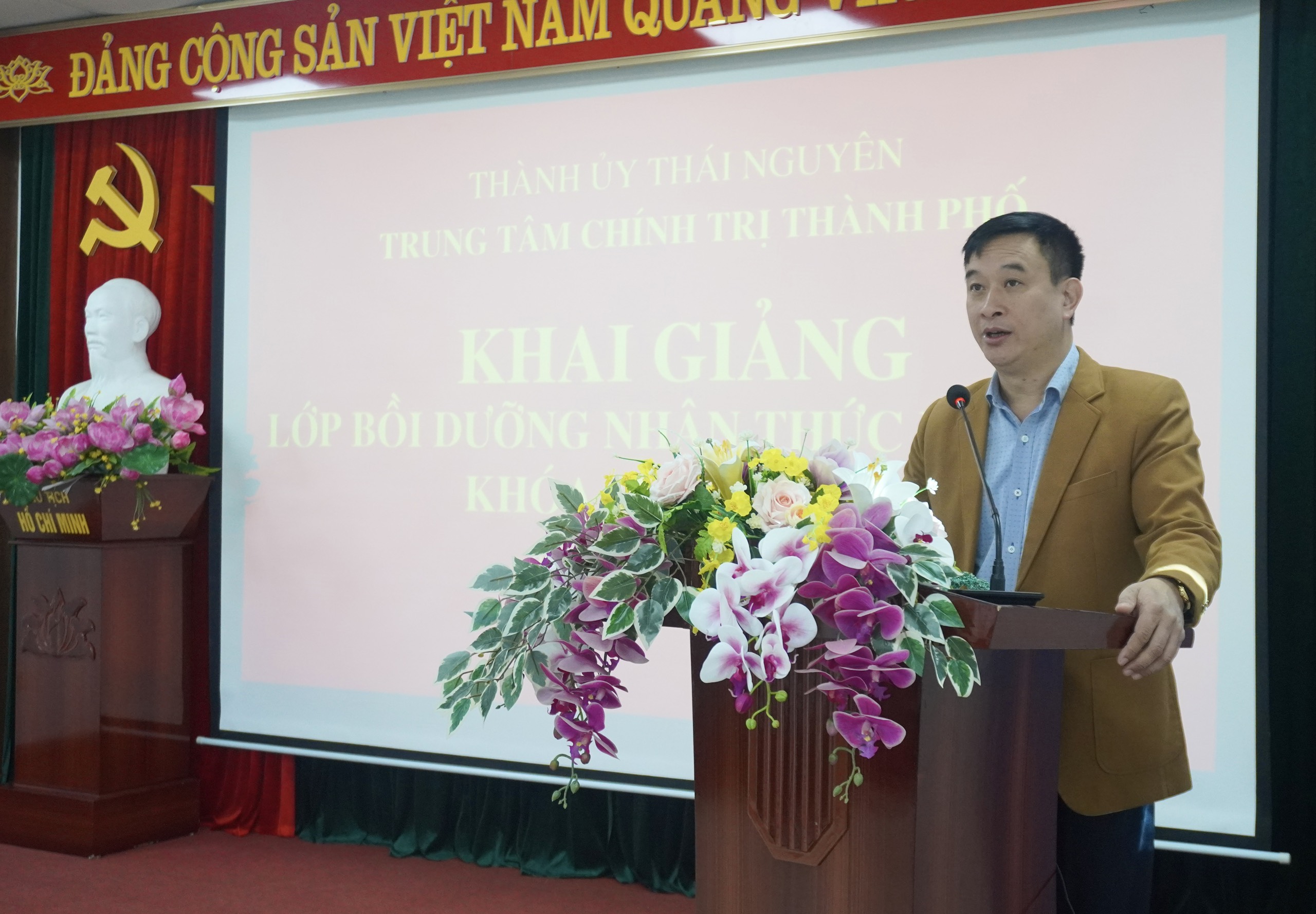 Đồng chí Hà Huy Hoàng, Ủy viên Ban Thường vụ Thành ủy – Trưởng Ban Tuyên giáo Thành ủy, Giám đốc Trung tâm Chính trị thành phố Thái Nguyên phát biểu khai giảng lớp học.