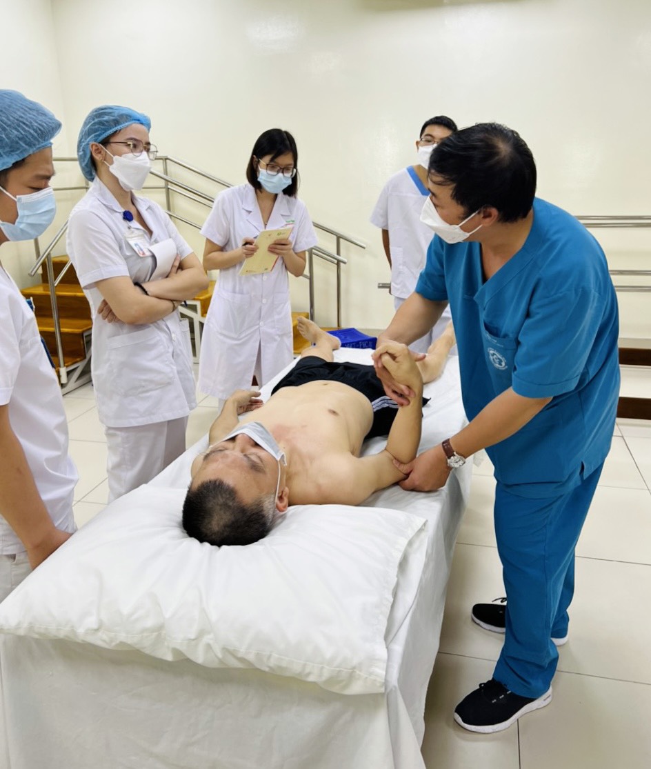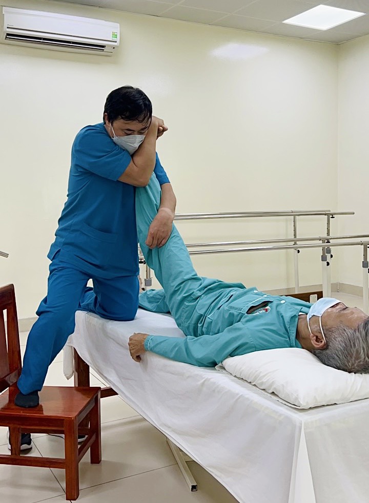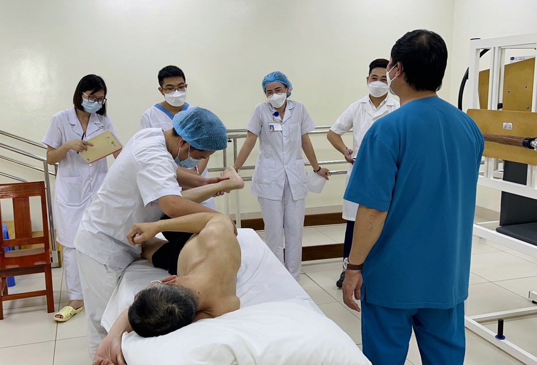 Chuyên viên cao cấp Đặng Văn Tú – Trung tâm Phục hồi chức năng, Bệnh viện Bạch Mai tiến hành thăm khám và điều trị cho bệnh nhân