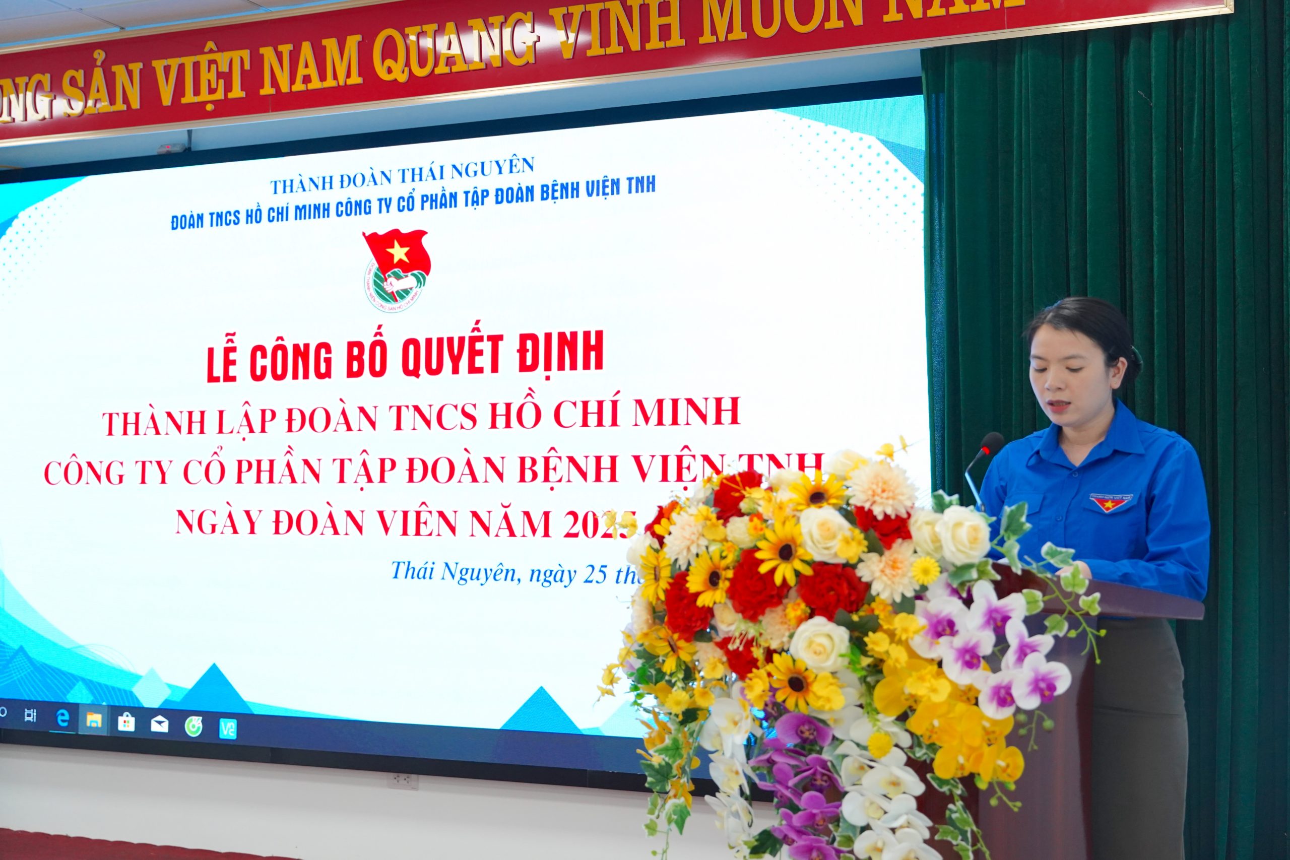 Tại buổi lễ, đồng chí Nguyễn Mai Biển – Phó Bí thư Thành đoàn Thái Nguyên đã công bố quyết định thành lập Đoàn TNCS Hồ Chí Minh Công ty Cổ phần Tập đoàn Bệnh viện TNH, đồng thời trao quyết định thành lập tổ chức Đoàn cho Ban Chấp hành lâm thời nhiệm kỳ đầu tiên.