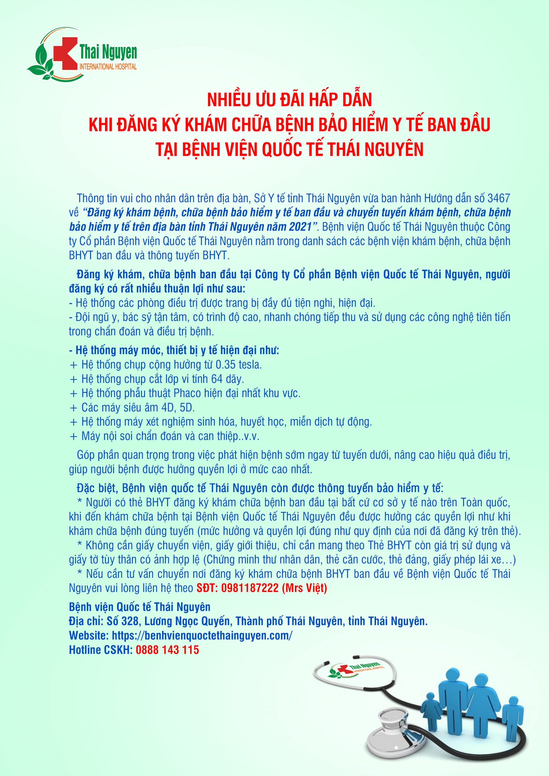 ??? Từ năm 2021, những người có đăng ký khám chữa bệnh ban đầu tại Bệnh viện Quốc tế Thái Nguyên được giảm trừ 20% phí dịch vụ kỹ thuật cao ngoài bảo hiểm y tế.