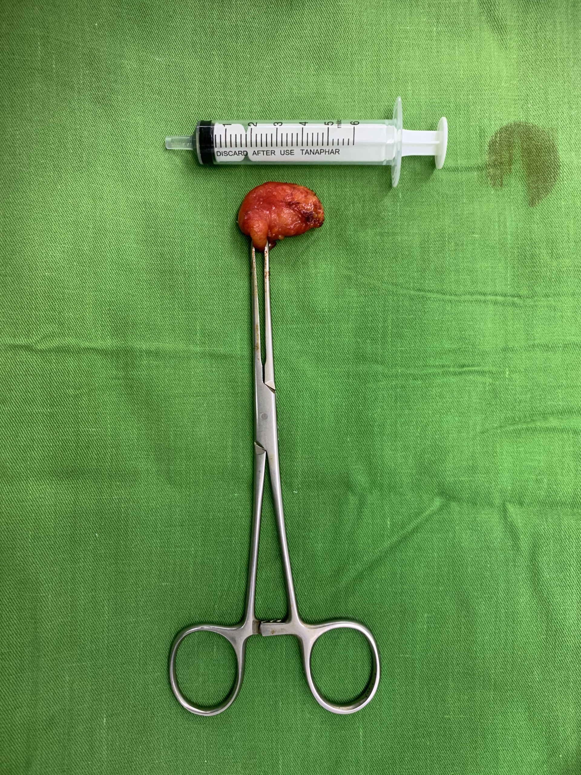 Trong quá trình phẫu thuật, bóc tách, nhận thấy khối u nằm sát thần kinh cằm, vị trí phức tạp, e kip bác sĩ Khoa Răng – Hàm – Mặt Bệnh viện Quốc tế Thái Nguyên đã tiến hành bóc tách bảo tồn thần kinh cằm và cắt bỏ khối u. Khối u sau khi cắt bỏ có kích thước 3x3cm. Kết quả giải phẫu bệnh là khối u mỡ lành tính. Sau 5 ngày hậu phẫu, hiện sức khỏe bệnh nhân đã ổn định và xuất viện.