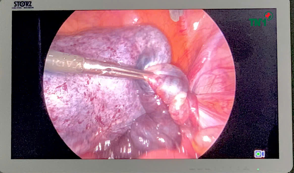 Trước tình trạng nguy cấp, ekip bác sĩ quyết định phẫu thuật nội soi khẩn cấp để cắt bỏ khối u. Sau 30 phút, khối u tím, căng, xoắn 3 vòng tại buồng trứng phải đã được bóc tách và loại bỏ thành công.
