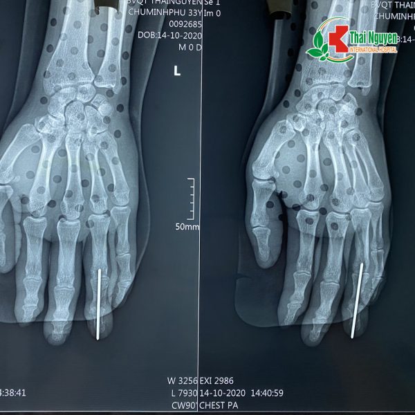 ??Khoảng 15h30 ngày 11/10, bệnh nhân Chu Minh.P, 33 tuổi, Quốc tịch Trung Quốc, làm việc tại Công ty Ván ép Việt Bắc, địa chỉ tại Tổ 2, Phường Phú Xá, thành phố Thái Nguyên nhập viện trong tình trạng bị thương bàn tay trái khi đang sử dụng máy cắt. Các bác sỹ nhanh chóng tiến hành thăm khám, chụp X-quang và nhận thấy: Bàn tay trái có nhiều vết thương nông, dài 2cm ở các ngón 1,2,3, đứt điểm bám gân duỗi ngón 2, riêng ngón 4 có vết thương dài 4 cm, dập nát lộ xương. Sau khi hội chẩn, các bác sỹ khoa Ngoại Chấn thương đã có chỉ định phẫu thuật điều trị gẫy đốt ngón tay số 4, kết hợp xử lý vết thương ở các ngón tay 1,2,3.
