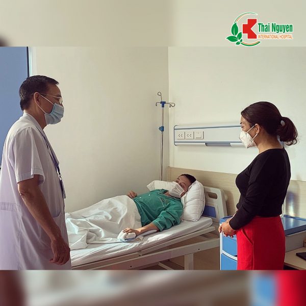 Bác sỹ CKII. Lê Văn Bằng- Trưởng Khoa Ngoại Chấn thương, Bệnh viện Quốc tế Thái Nguyên đang thăm hỏi tình hình sức khỏe của bệnh nhân P.