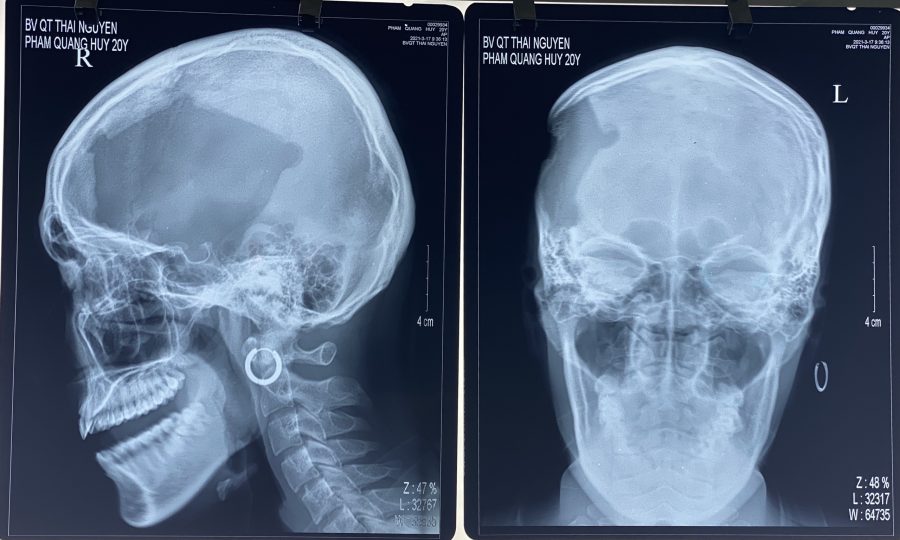?Bạn Phạm Quang.H, 20 tuổi, địa chỉ tại quận Thanh Xuân, thành phố Hà Nội, đã phẫu thuật sọ não mở sọ cách đây 4 tháng, nay còn ổ khuyết sọ. Các bác sỹ tiến hành thăm khám, chụp Xquang sọ thẳng nghiêng nhận thấy: Sọ não vùng thái dương đỉnh phải có ổ khuyết sọ 10x10cm, có chỉ định phẫu thuật vá sọ tự thân.