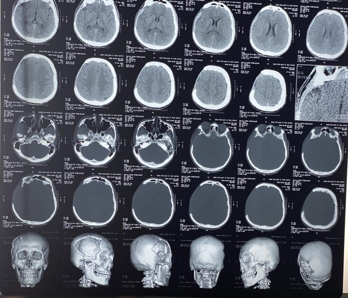 Hình ảnh chụp Xquang và CT scan của Bệnh nhân Phạm Quang.H thấy rõ khuyết sọ 10x10cm