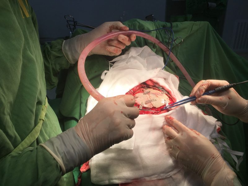 ?Trong quá trình phẫu thuật, các bác sĩ đã tiến hành lấy xương sọ tự thân vá vào chỗ xương sọ khuyết và cố định mảnh xương sọ bằng 5 cầu titan; khâu treo màng cứng cho bệnh nhân.