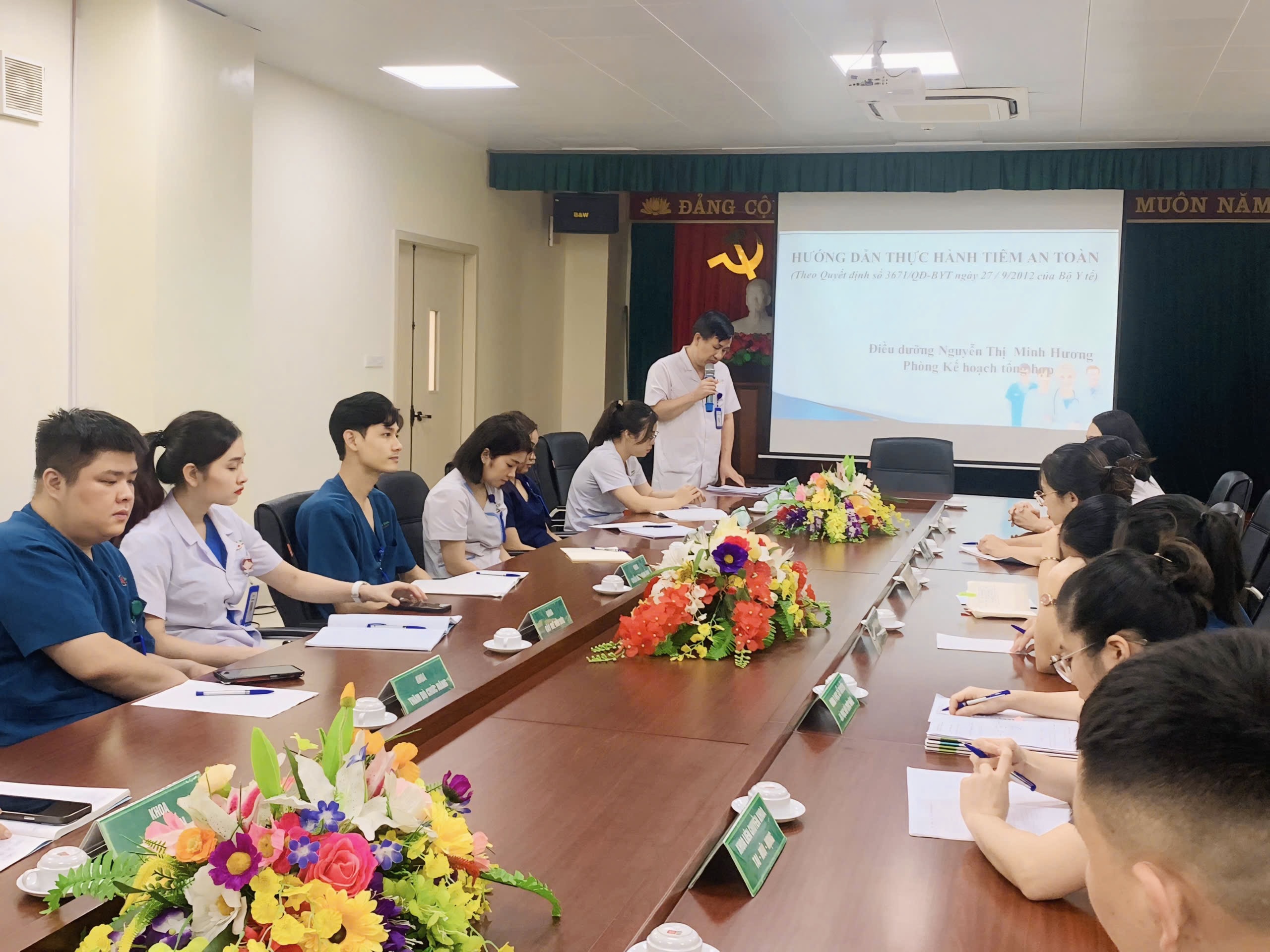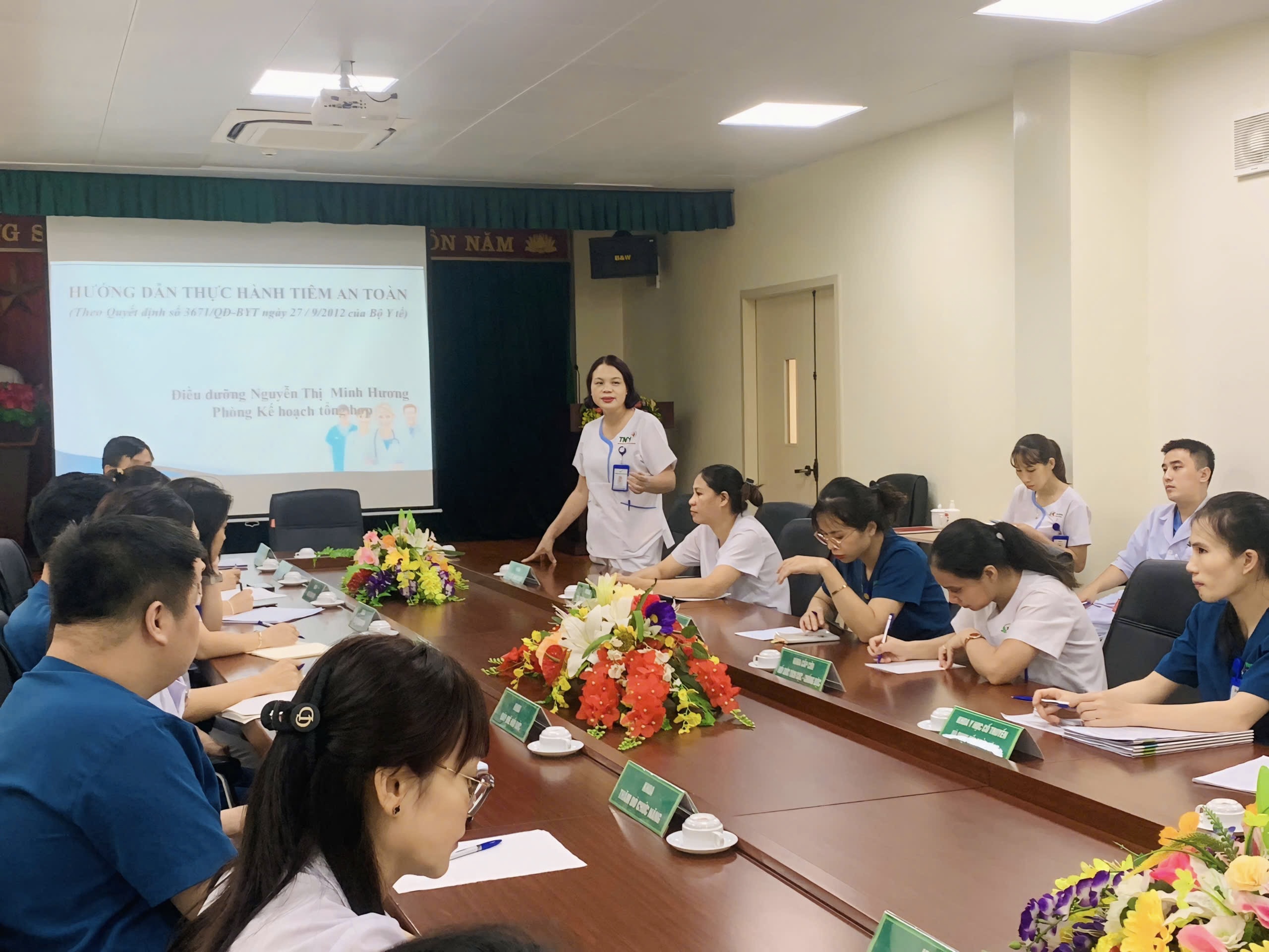 Tại buổi tập huấn, bà Nguyễn Thị Minh Hương – Điều dưỡng trưởng Bệnh viện đã trực tiếp truyền đạt nội dung: Hướng dẫn Tiêm An toàn trong các cơ sở khám bệnh, chữa bệnh theo Quyết định số 3671/QĐ-BYT ngày 27/9/2012 của Bộ Y tế. Đây là một trong những nội dung nằm trong chương trình đào tạo liên tục của Bộ Y tế.