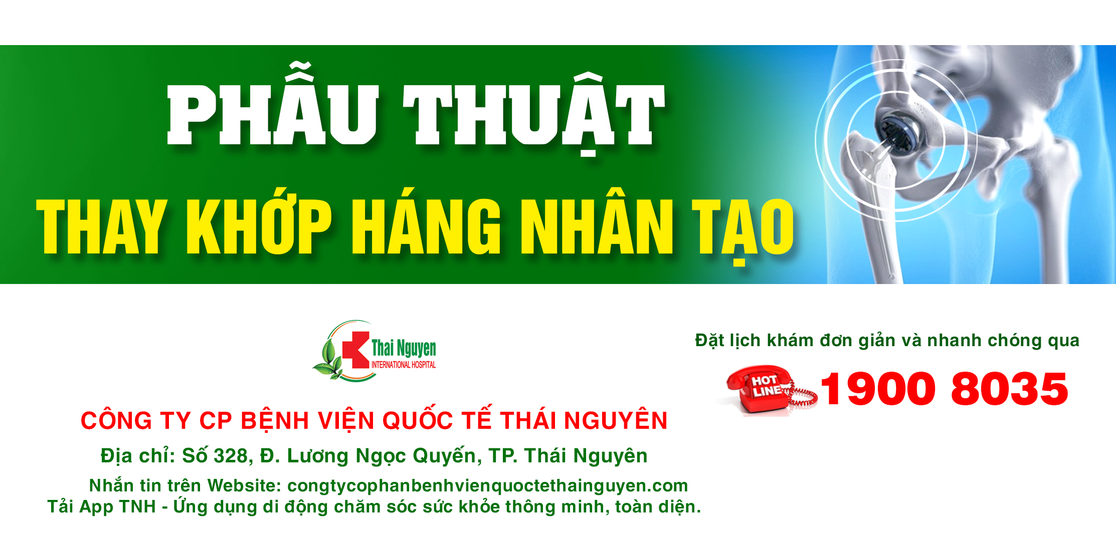 Hiện phẫu thuật thay khớp háng nhân tạo đã được thực hiện thường quy tại Bệnh viện Quốc tế Thái Nguyên và Bệnh viện Đa khoa Yên Bình Thái Nguyên, với nhiều ưu điểm: