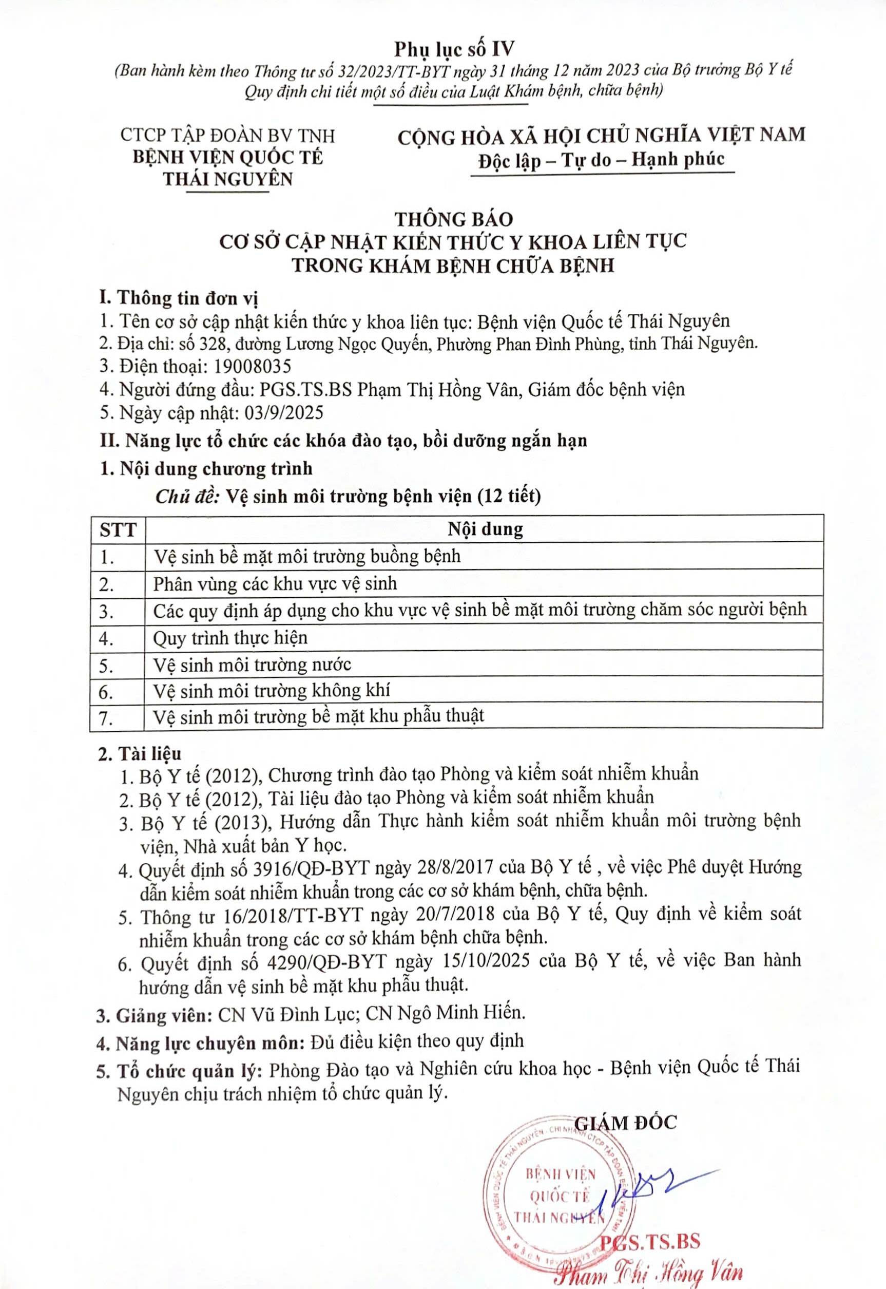 Bệnh viện Quốc tế Thái Nguyên trực thuộc CTCP Tập đoàn Bệnh viện TNH thông báo Cơ sở cập nhập kiến thức y khoa liên tục trong khám bệnh chữa bệnh.
