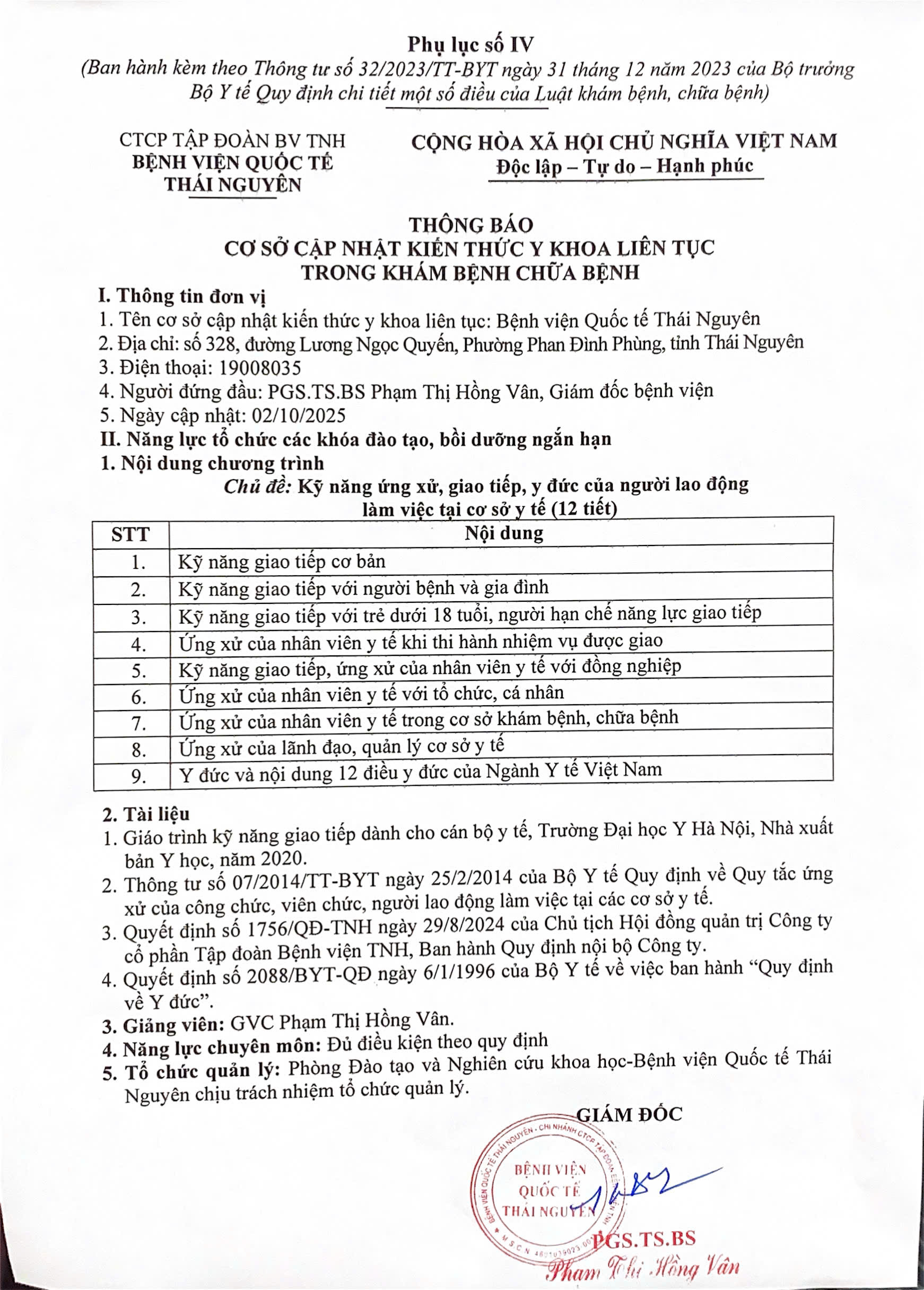 Bệnh viện Quốc tế Thái Nguyên trực thuộc CTCP Tập đoàn Bệnh viện TNH thông báo Cơ sở cập nhập kiến thức y khoa liên tục trong khám bệnh chữa bệnh.