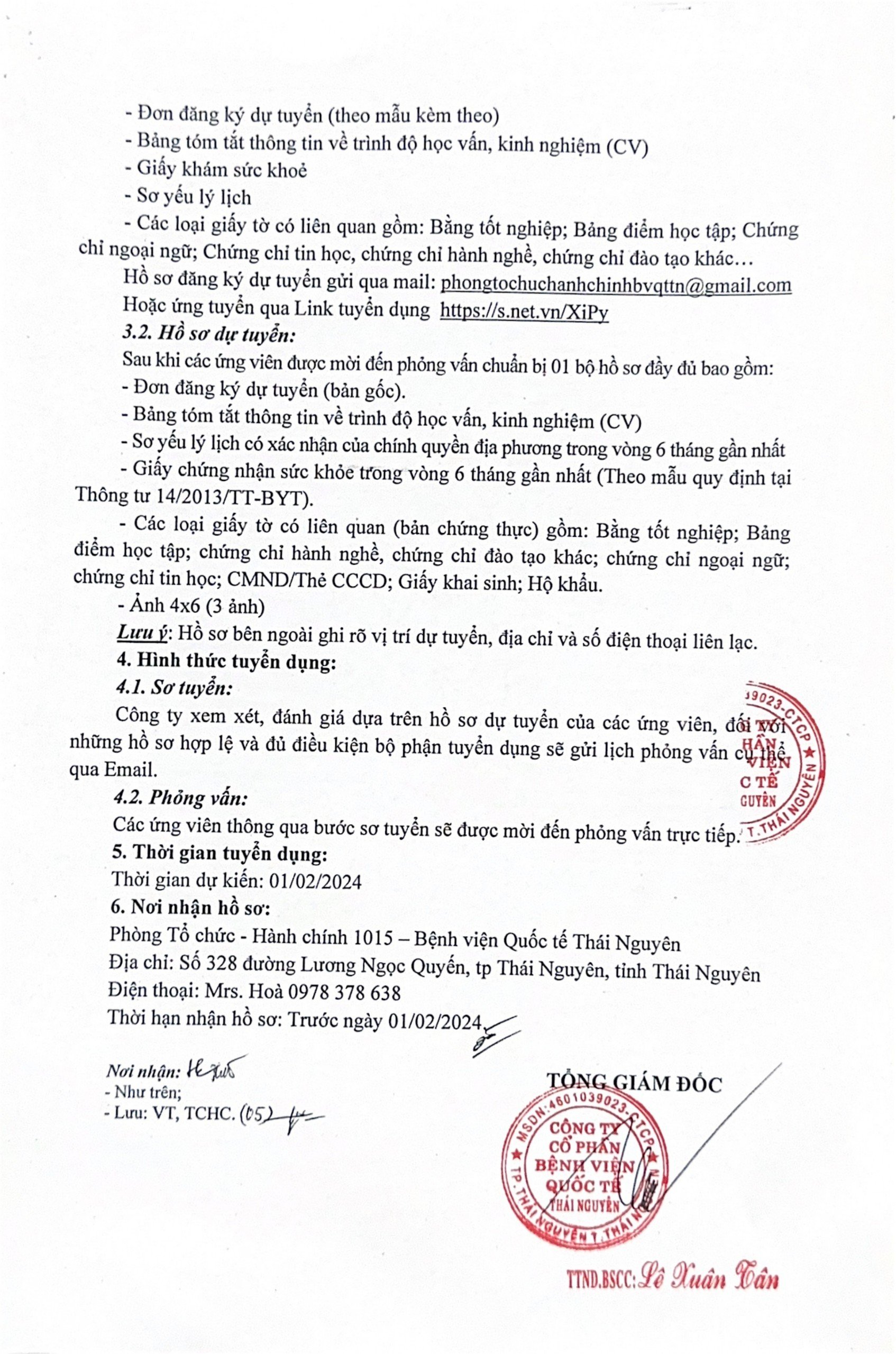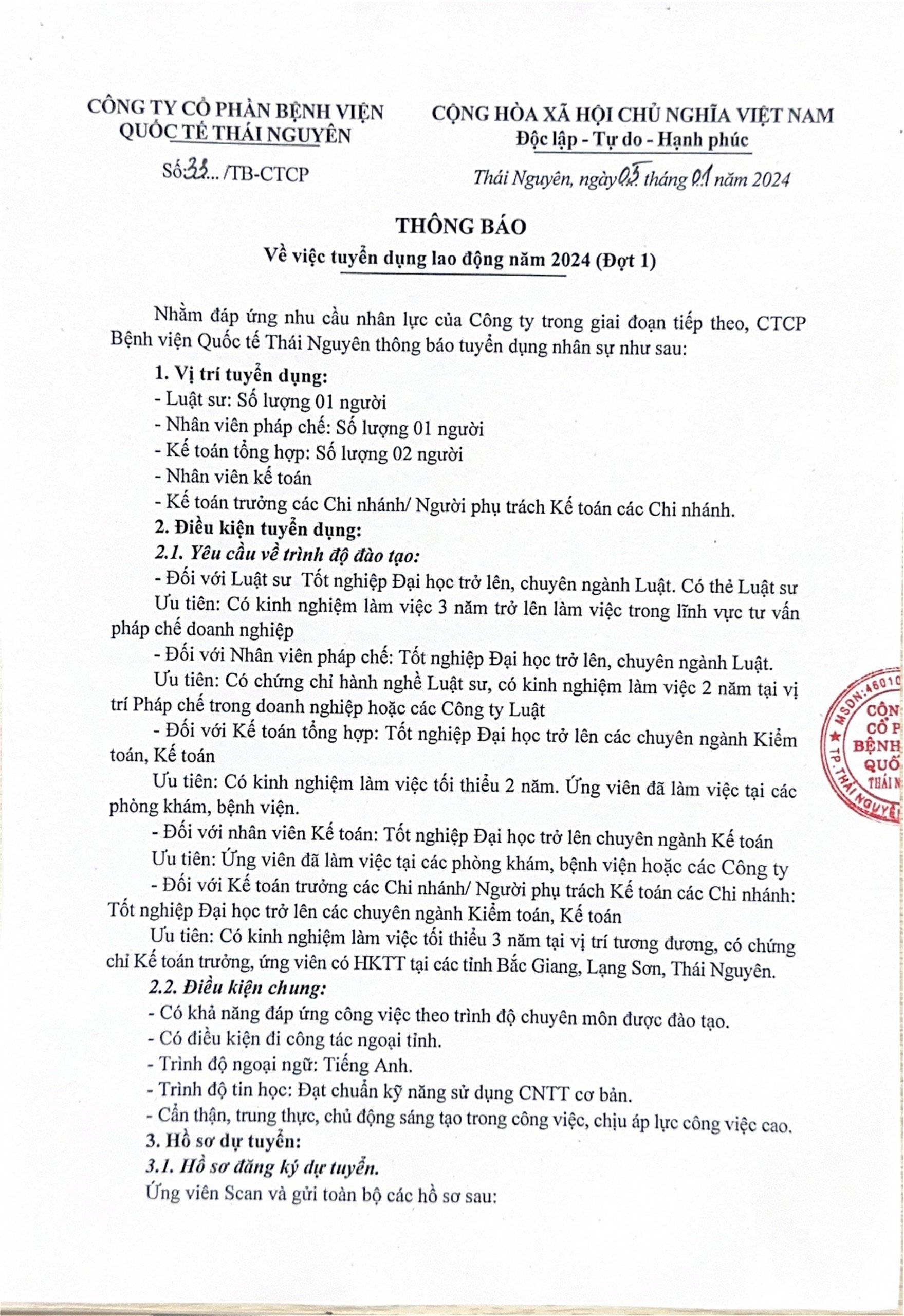 CTCP Bệnh viện Quốc tế Thái Nguyên thông báo tuyển dụng nhân sự như sau: