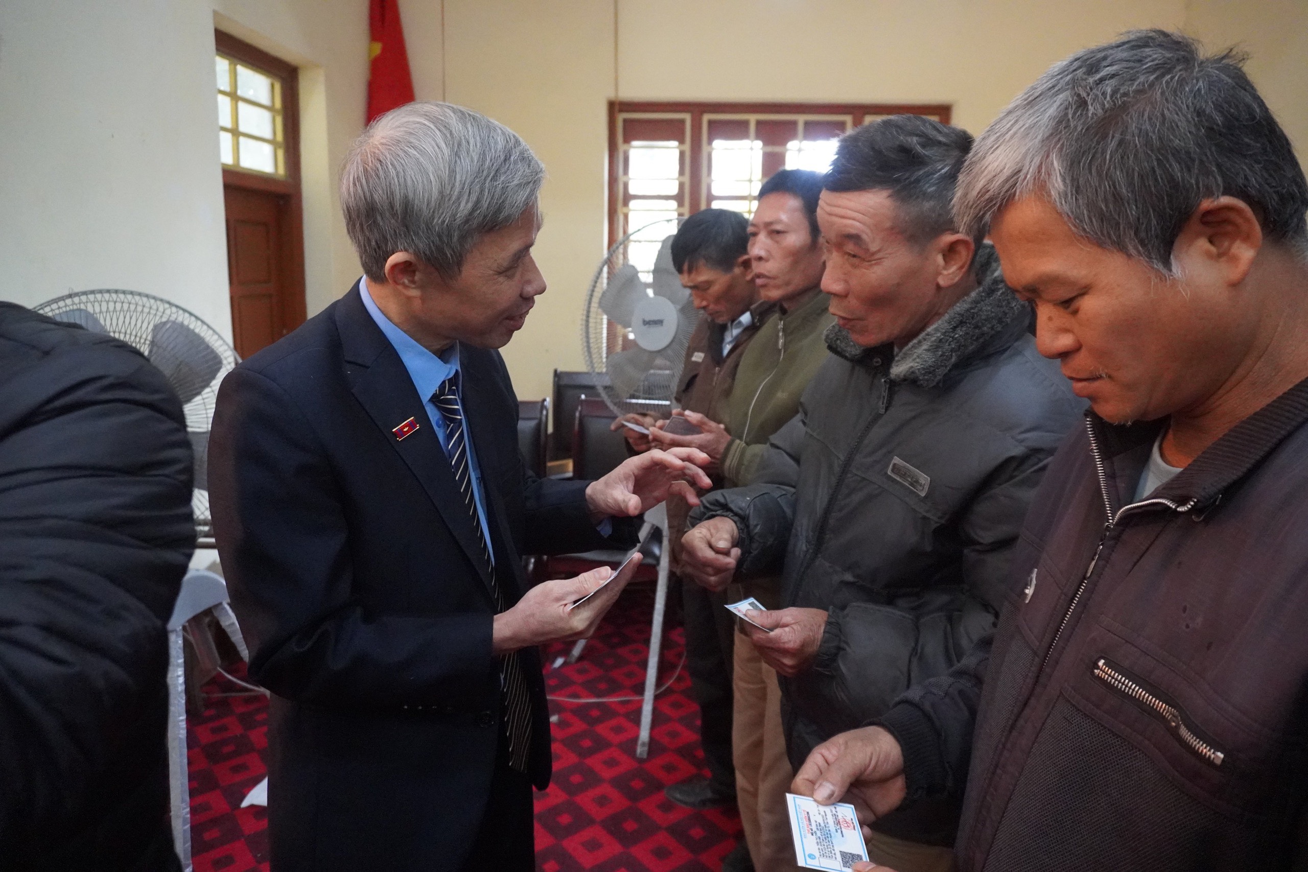 Ths.BSCKII Phan Bá Đào- Phó Giám đốc Bệnh viện Quốc tế Thái Nguyên và đại diện BHXH tỉnh trao thẻ BHYT cho người dân có hoàn cảnh khó khăn xã Bản Ngoại.
