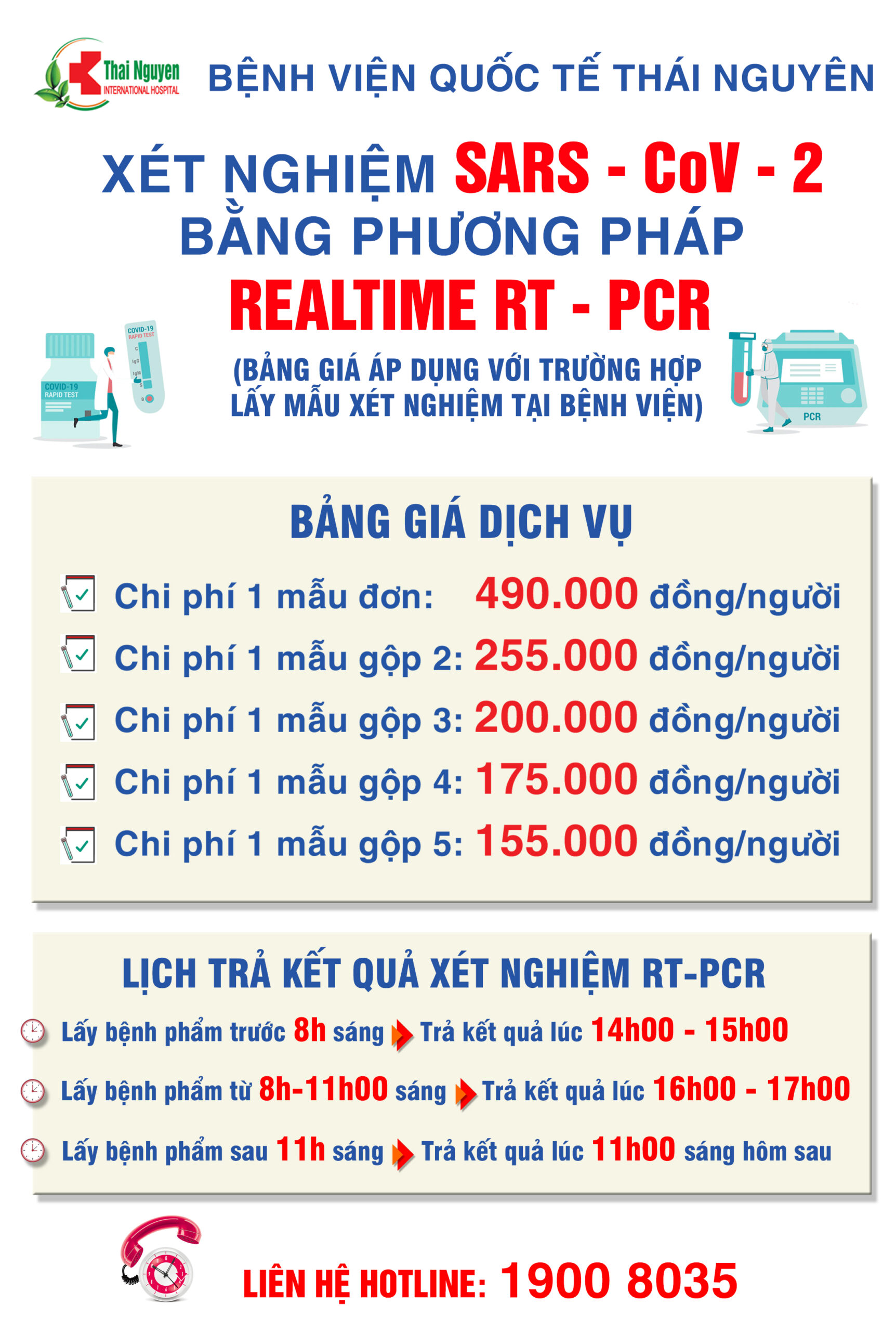 ?Nhằm đáp ứng nhu cầu kiểm tra, sàng lọc COVID-19 cho người dân, đơn vị, doanh nghiệp…Bệnh viện Quốc tế Thái Nguyên cung cấp dịch vụ xét nghiệm sàng lọc SARS-CoV-2 bằng phương pháp Realtime RT-PCR. ?Các quy trình thực hiện lấy mẫu, xét nghiệm được Bệnh viện tuân thủ nghiêm ngặt, đảm bảo an toàn cho khách hàng và nhân viên y tế. ?Thông tin chi tiết xin liên hệ: BỆNH VIỆN QUỐC TẾ THÁI NGUYÊN