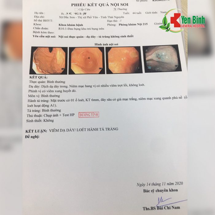 Mới đây, Bệnh nhân T.C.H, 44 tuổi, địa chỉ ở xã Đắc Sơn, thị xã phổ Yên, Thái Nguyên cảm thấy thường xuyên đau bụng không rõ nguyên nhân, đã đến Bệnh viện Đa khoa Yên Bình Thái Nguyên để thăm khám, nội soi tiêu hóa. Sau khi tiến hành nội soi, các bác sỹ phát hiện bệnh nhân bị viêm dạ dày, loét hành tá tràng với 1 ổ loét kích thước 6mm, HP dương tính, có nguy cơ phát triển thành ung thư dạ dày. Đây chỉ là một trong rất nhiều trường hợp bệnh nhân đến thăm khám, nội soi tiêu hóa khi bệnh đã phát tác, nên việc điều trị sẽ khó khăn hơn nhiều.