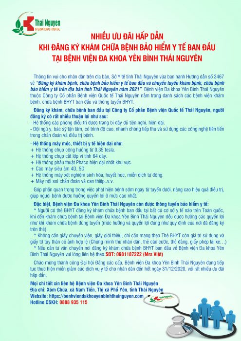??Thông tin vui cho nhân dân trên địa bàn, Sở Y tế tỉnh Thái Nguyên vừa ban hành Hướng dẫn số 3467 về “Đăng ký khám bệnh, chữa bệnh bảo hiểm y tế ban đầu và chuyển tuyến khám bệnh, chữa bệnh bảo hiểm y tế trên địa bàn tỉnh Thái Nguyên năm 2021”. Bệnh viện Đa khoa Yên Bình Thái Nguyên thuộc Công ty Cổ phần Bệnh viện Quốc tế Thái Nguyên nằm trong danh sách các bệnh viện khám bệnh, chữa bệnh BHYT ban đầu và thông tuyến BHYT.